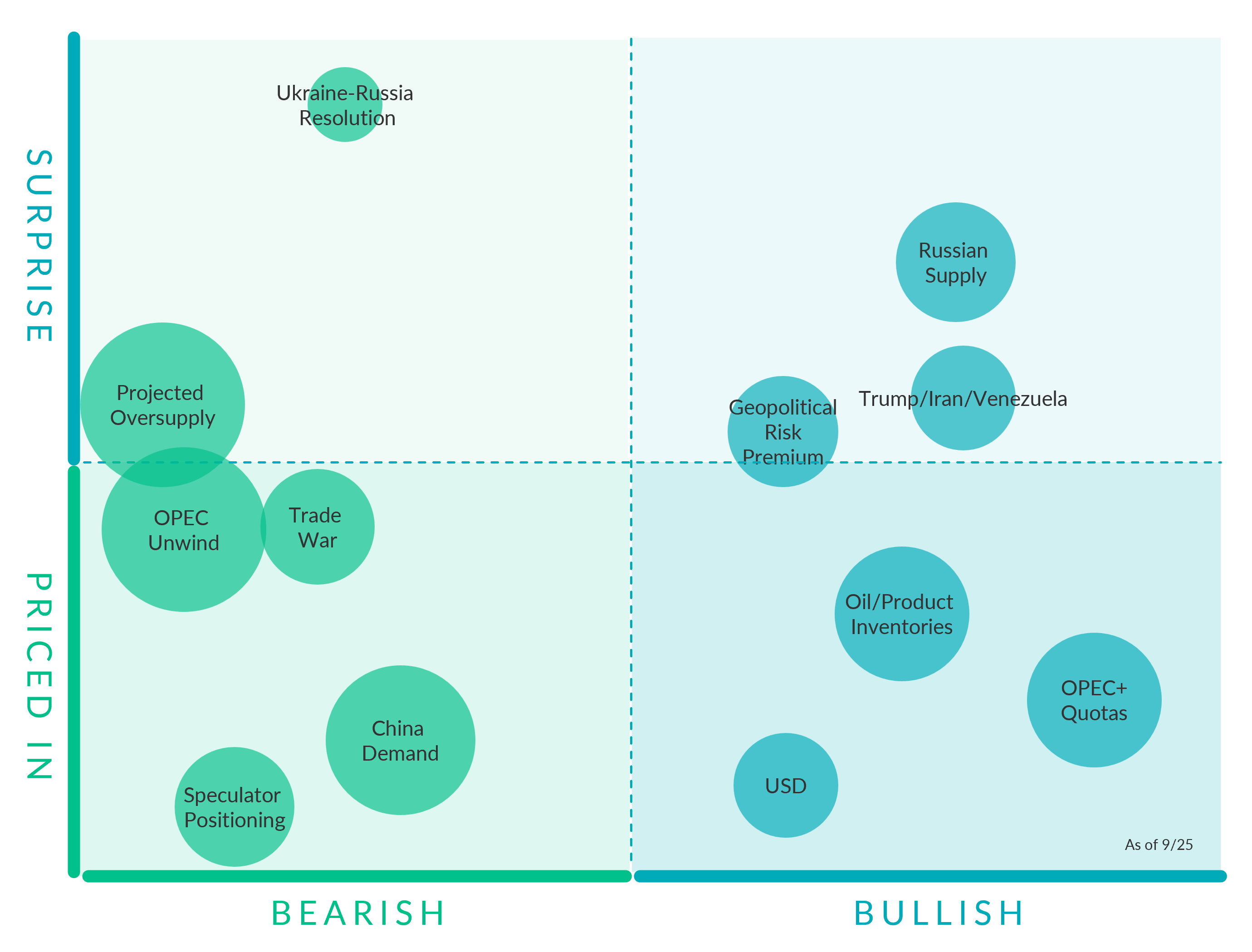 Projected Oversupply. (Bearish, Mostly Surprise) According to the EIA, global oil inventories are expected to rise by an average of 1.7 MMBbl/d in 2025, followed by a slightly slower but still significant 1.6 MMBbl/d increase in 2026. The most aggressive builds are forecast for 4Q 2025 and 1Q 2026, when inventories are projected to swell by 2.3 MMBbl/d on average.