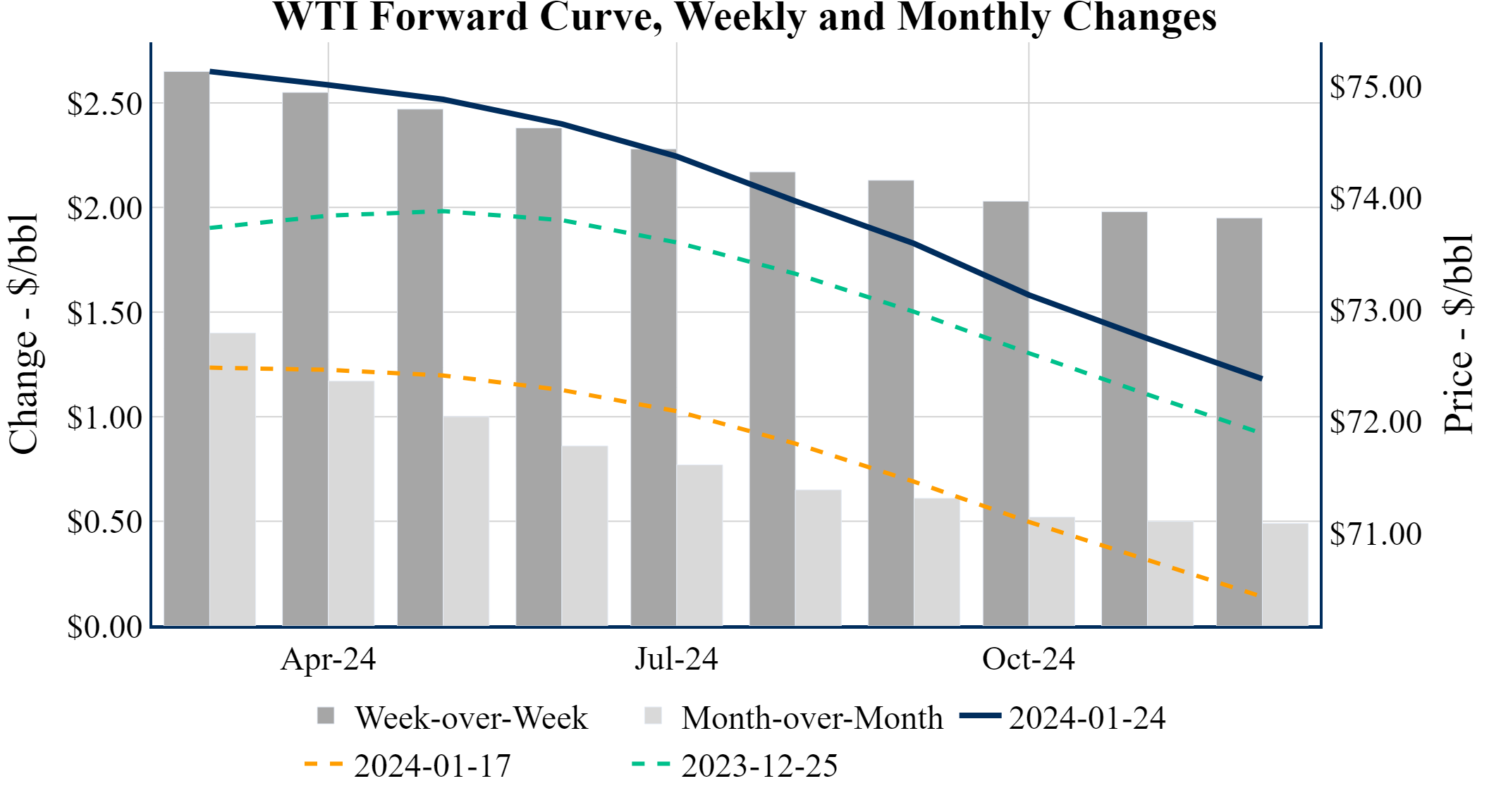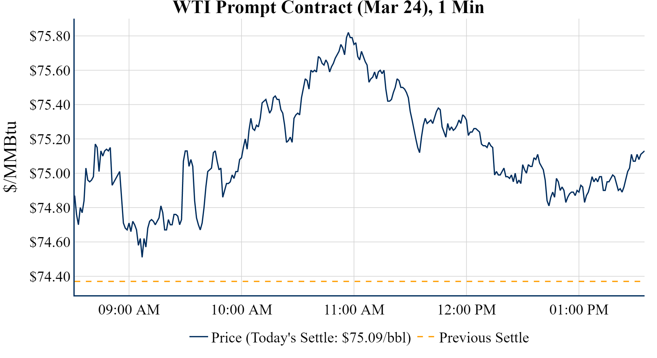 Prompt-Month WTI (Mar 24) was up $0.72 on the day, to settle at $75.09