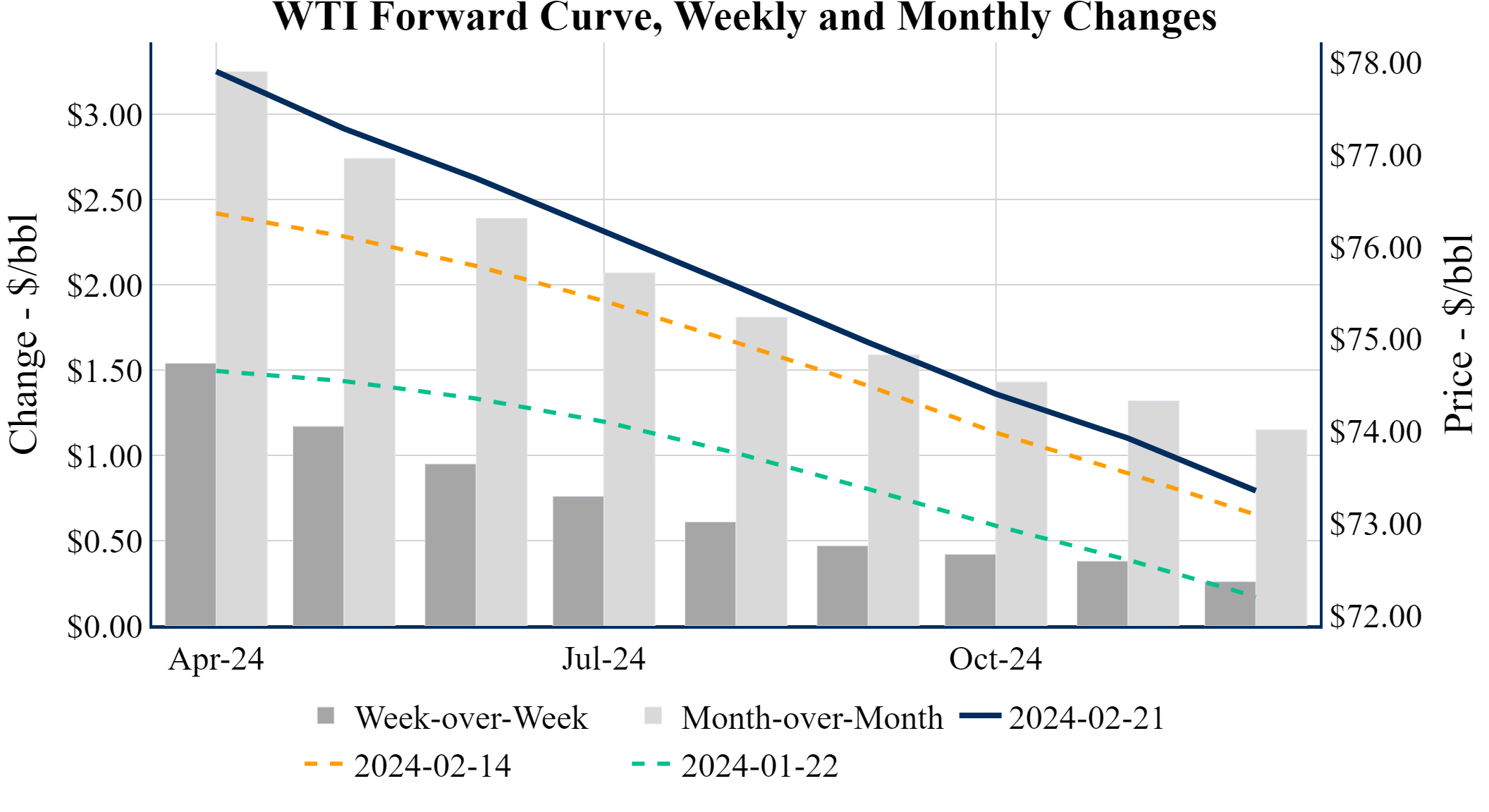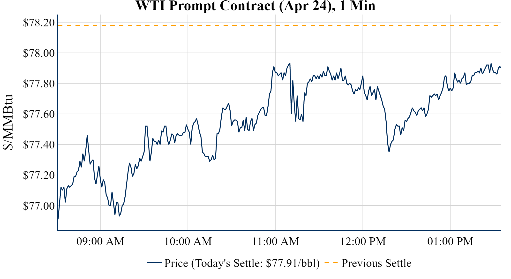 Prompt-Month WTI (Apr 24) was up $0.87 on the day, to settle at $77.91