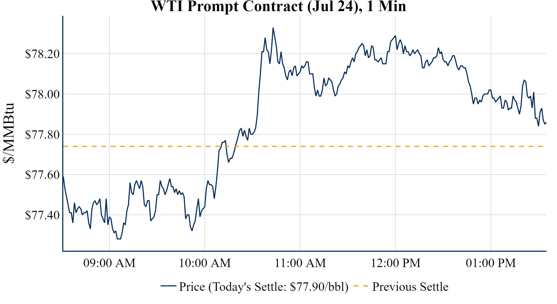 Prompt-Month WTI (Jul 24) was up $0.16 on the day, to settle at $77.90