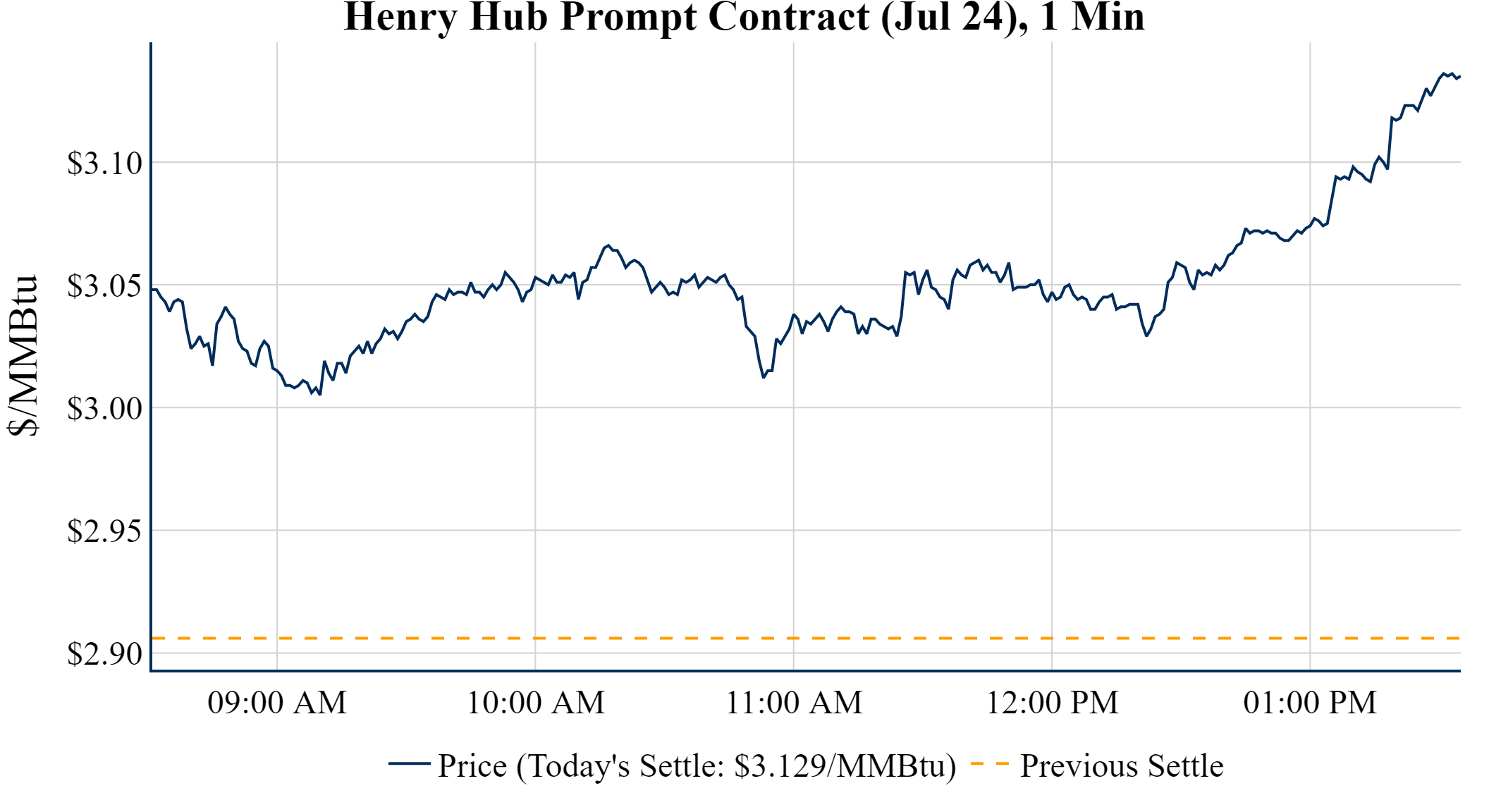 Prompt-Month Henry Hub (Jul 24) was up $0.223 on the day, to settle at $3.129