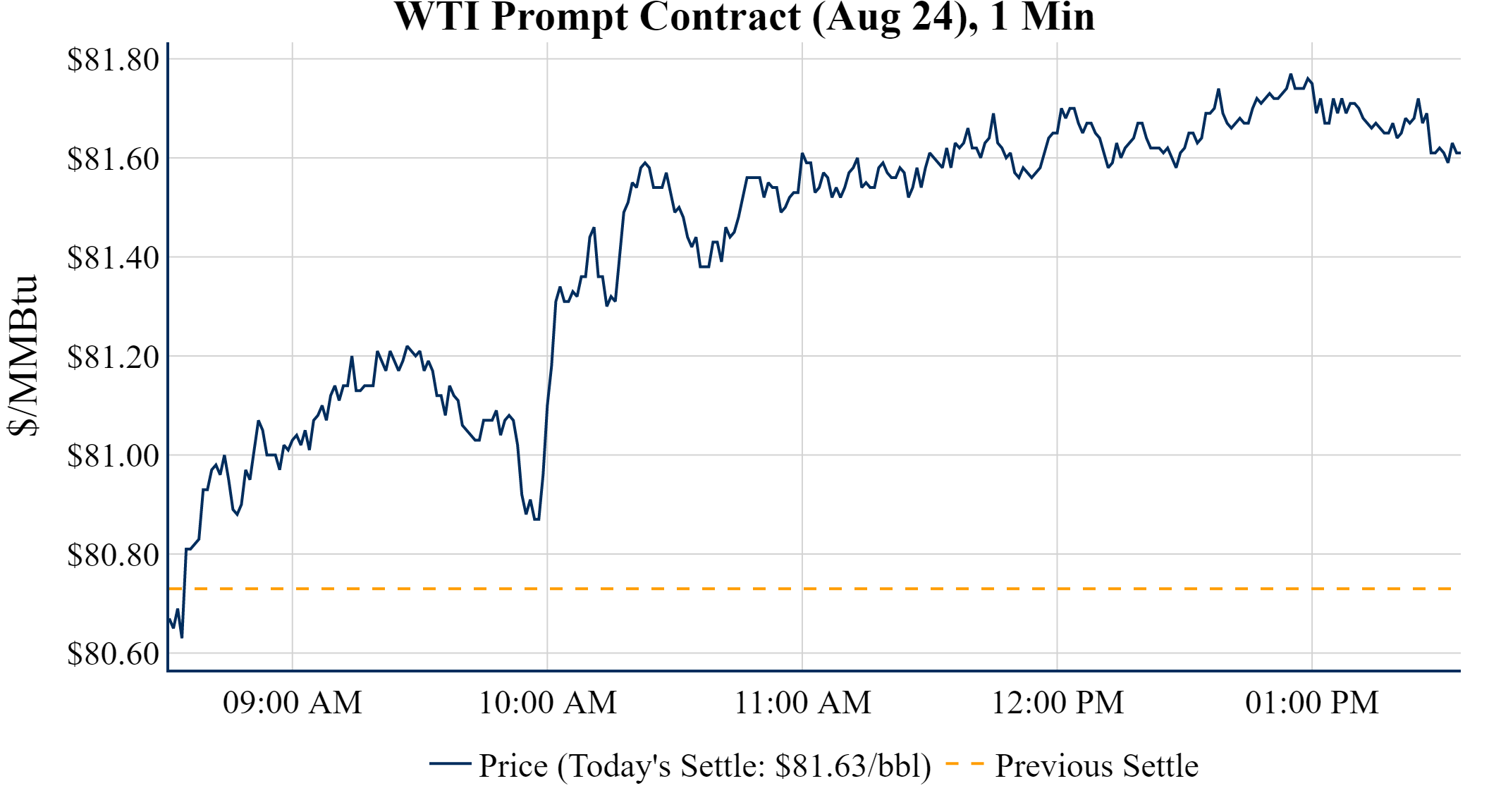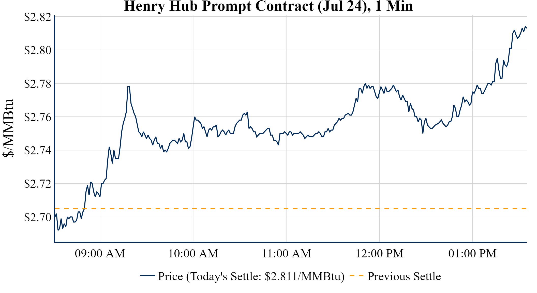 Prompt-Month Henry Hub (Jul 24) was up $0.106 on the day, to settle at $2.811Prompt-Month WTI (Aug 24) was up $0.90 on the day, to settle at $81.63