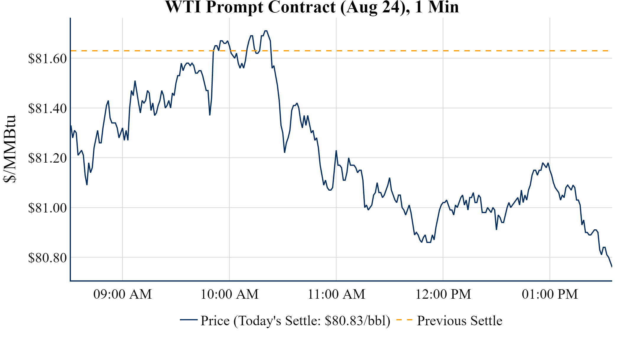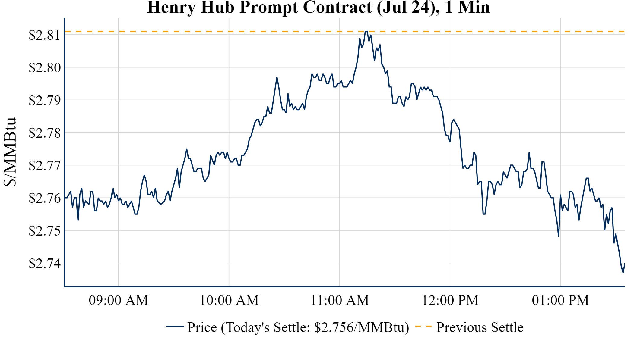 Prompt-Month Henry Hub (Jul 24) was down $-0.055 on the day, to settle at $2.756 Prompt-Month WTI (Aug 24) was down $-0.80 on the day, to settle at $80.83