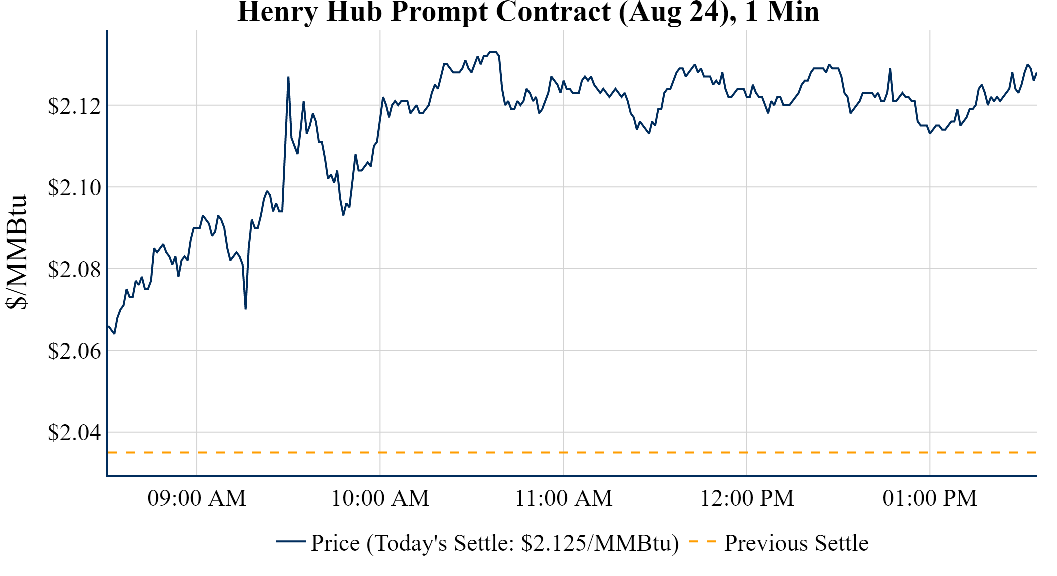 Prompt-Month Henry Hub (Aug 24) was up $0.090 on the day, to settle at $2.125