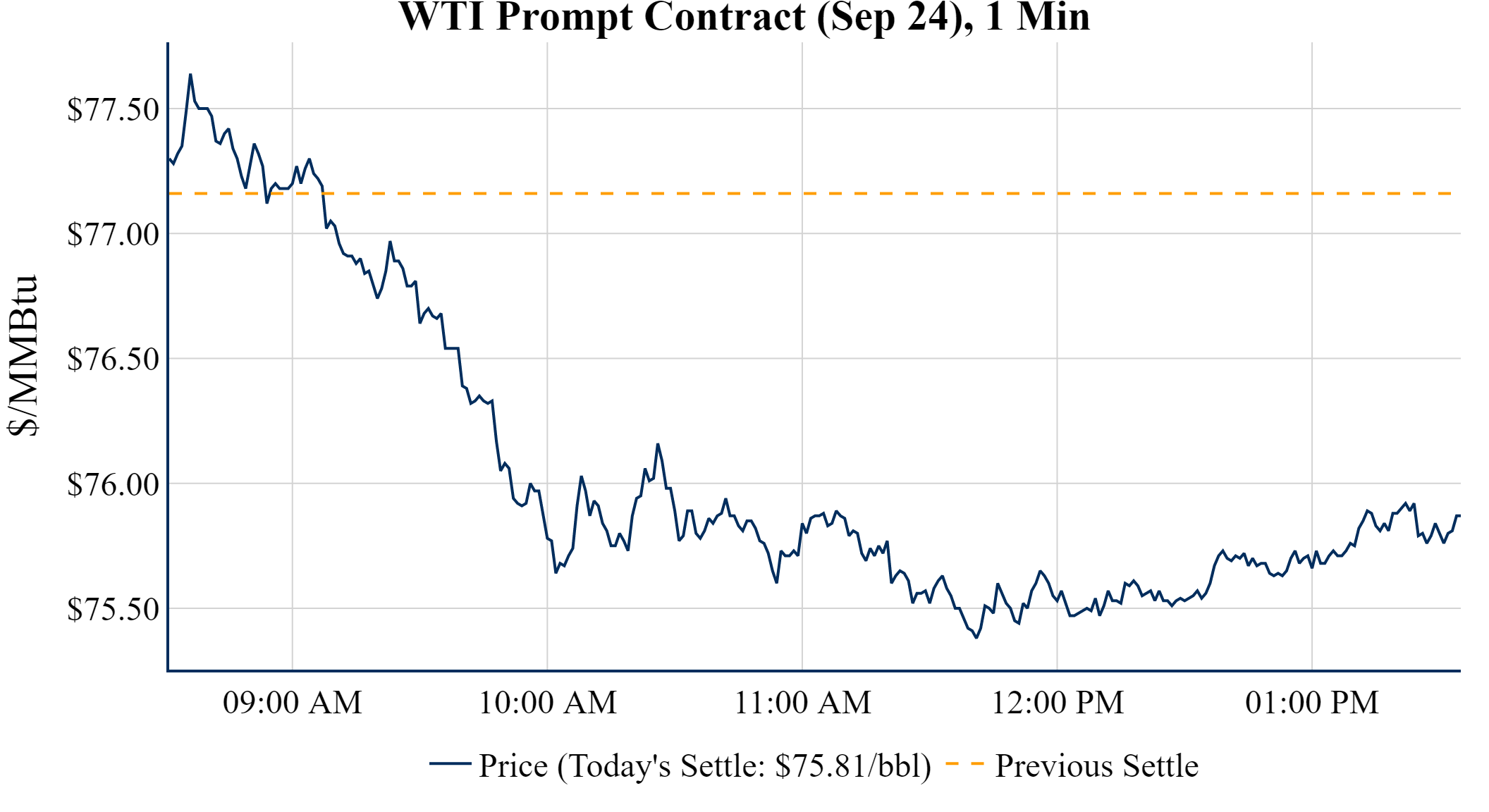 Prompt-Month WTI (Sep 24) was down $-1.35 on the day, to settle at $75.81