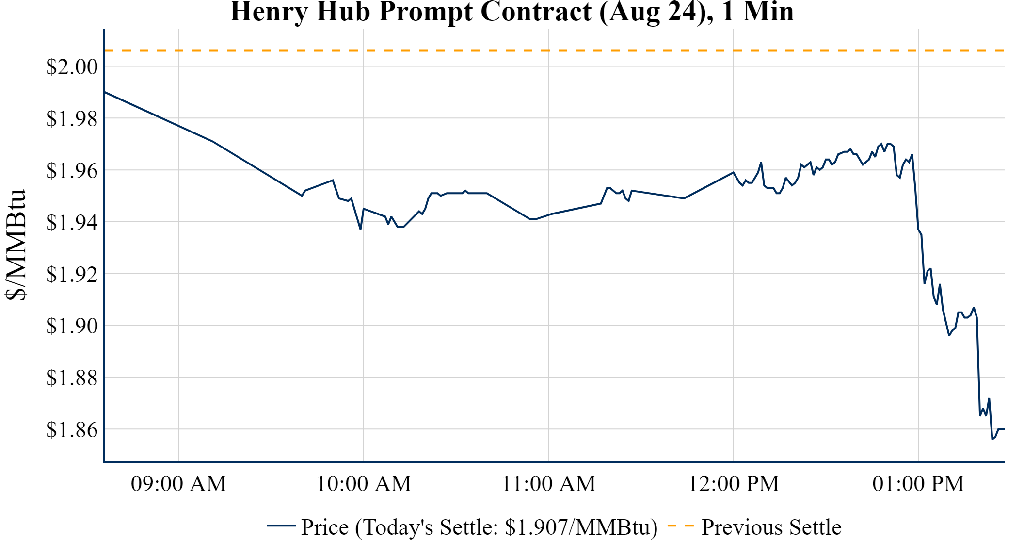 Prompt-Month Henry Hub (Aug 24) was down $-0.099 on the day, to settle at $1.907