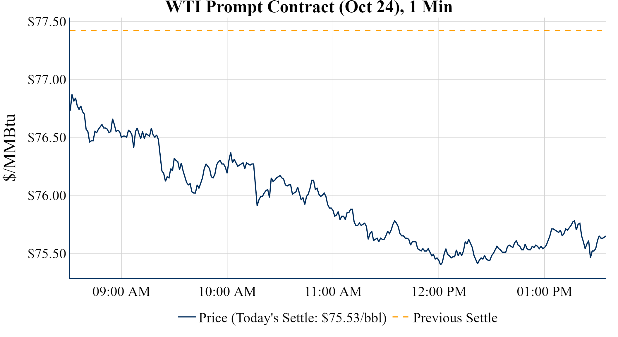 Prompt-Month WTI (Oct 24) was down $-1.89 on the day, to settle at $75.53