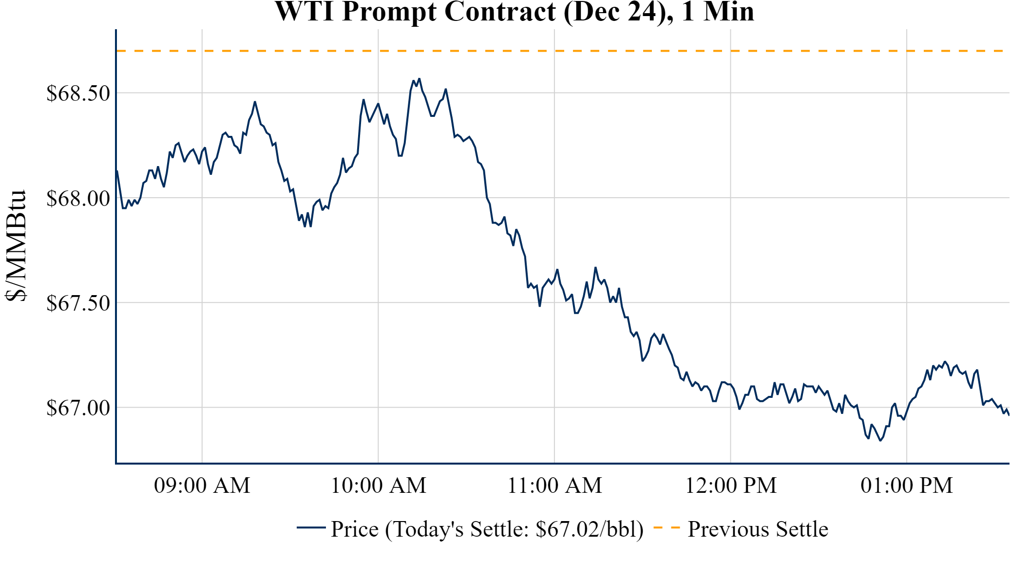 Prompt-Month Henry Hub (Dec 24) was up $0.038 on the day, to settle at $2.823Prompt-Month WTI (Dec 24) was down $-1.68 on the day, to settle at $67.02