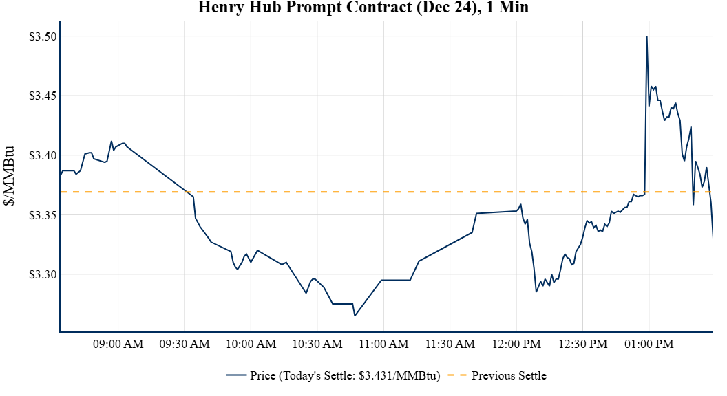Prompt-Month Henry Hub (Dec 24) was up $0.062 on the day, to settle at $3.431Prompt-Month WTI (Jan 25) was down $0.17 on the day, to settle at $68.77