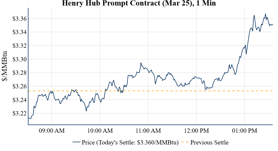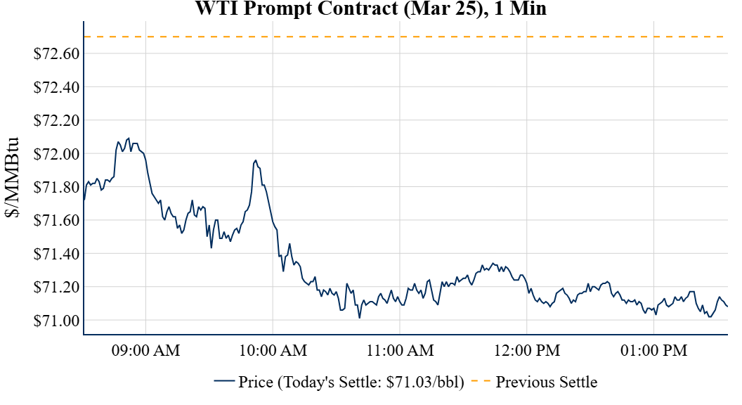 Prompt-Month Henry Hub (Mar 25) was up $0.107 on the day, to settle at $3.360Prompt-Month WTI (Mar 25) was down $1.67 on the day, to settle at $71.03