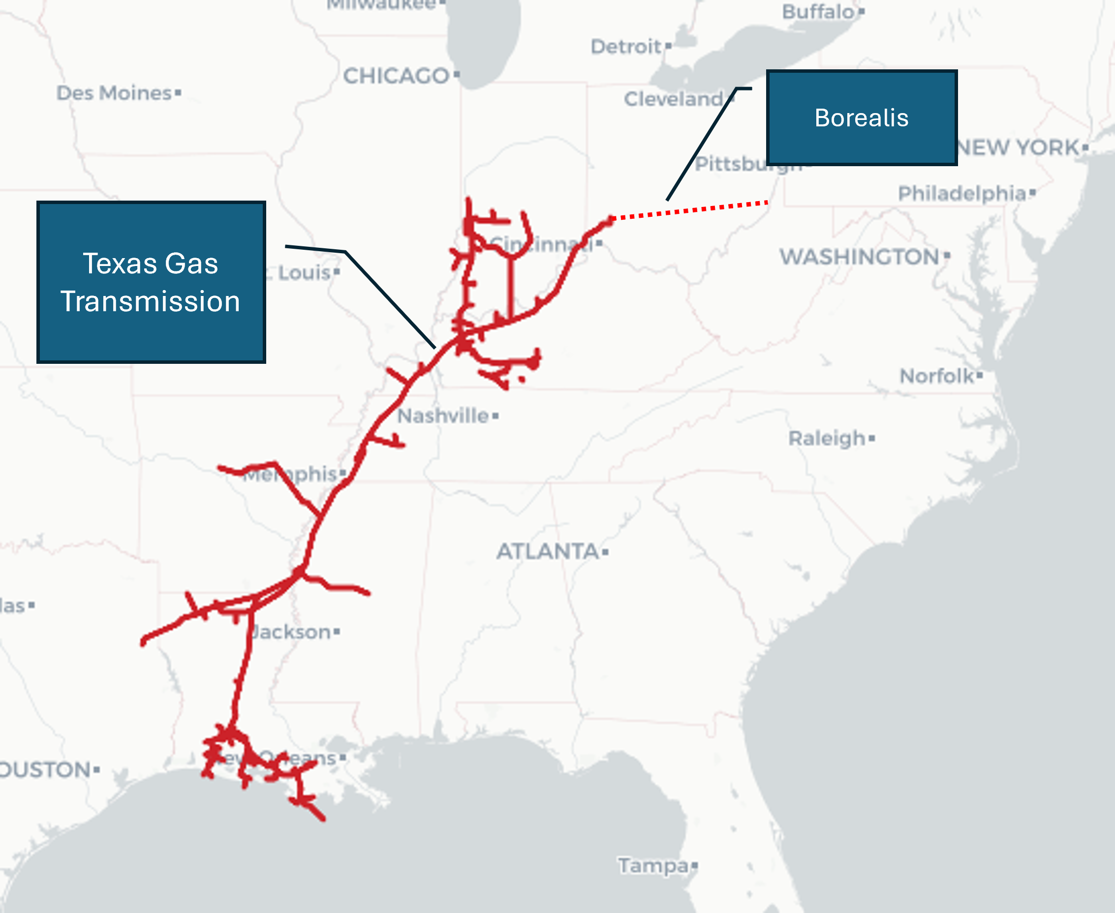 | TGT Borealis Project—On April 1, 2025, Boardwalk Pipelines announced a new Texas Gas Transmission pipeline expansion. The project involves a 2 Bcf/d greenfield line running from existing infrastructure in Lebanon, Ohio, to Clarington in eastern Ohio. No timeline has been given yet, but it's estimated that the line should enter service by the end of the decade. The project should result in higher productive capacity in the Marcellus and Utica. |