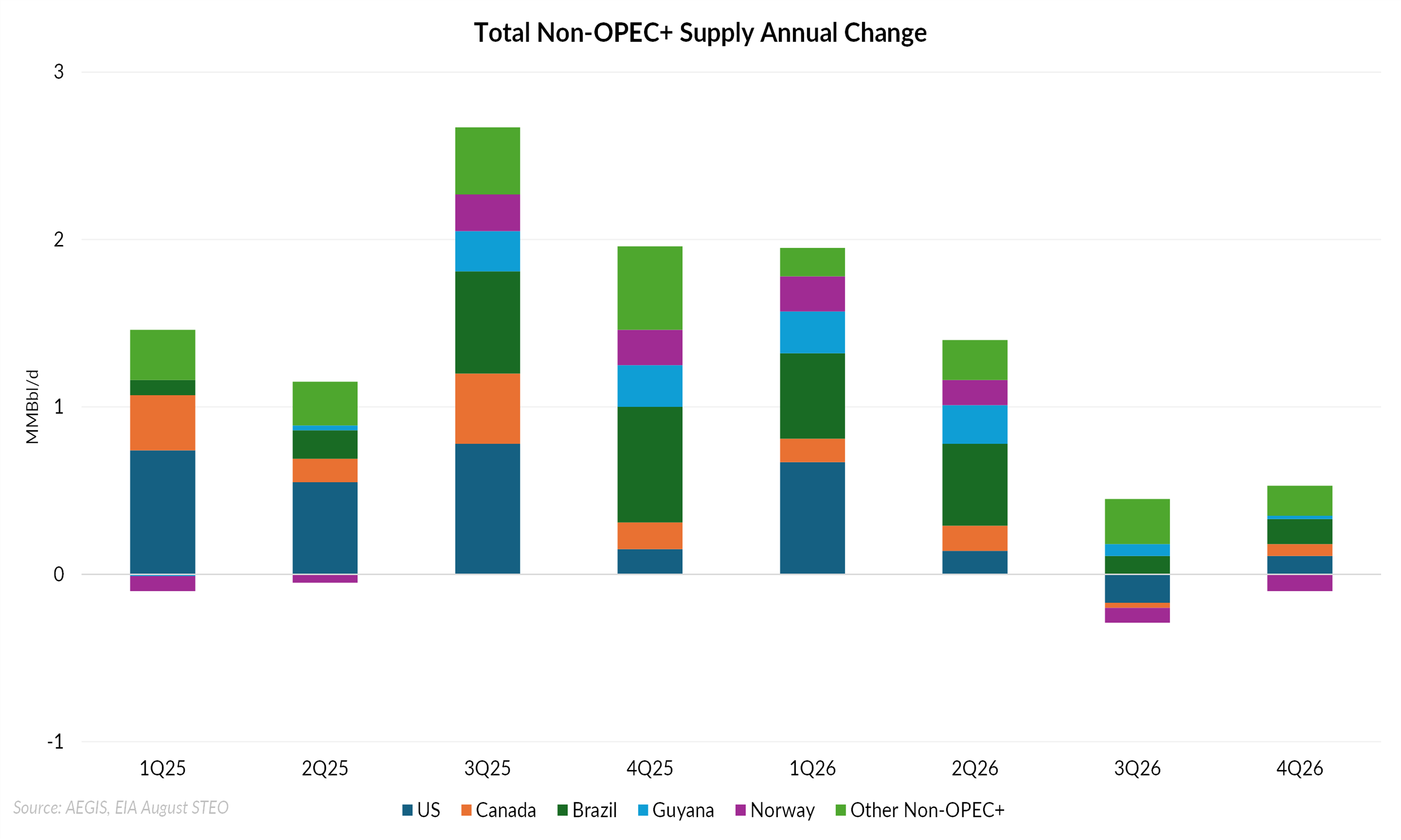 In the United States, production continues to underpin non-OPEC growth. Output reached a record 13.6 MMBbl/d in July, prompting the EIA to raise its forecast to 13.5 MMBbl/d for both 2025 and 2026, up 0.2 MMBbl/d from last month’s projection.
