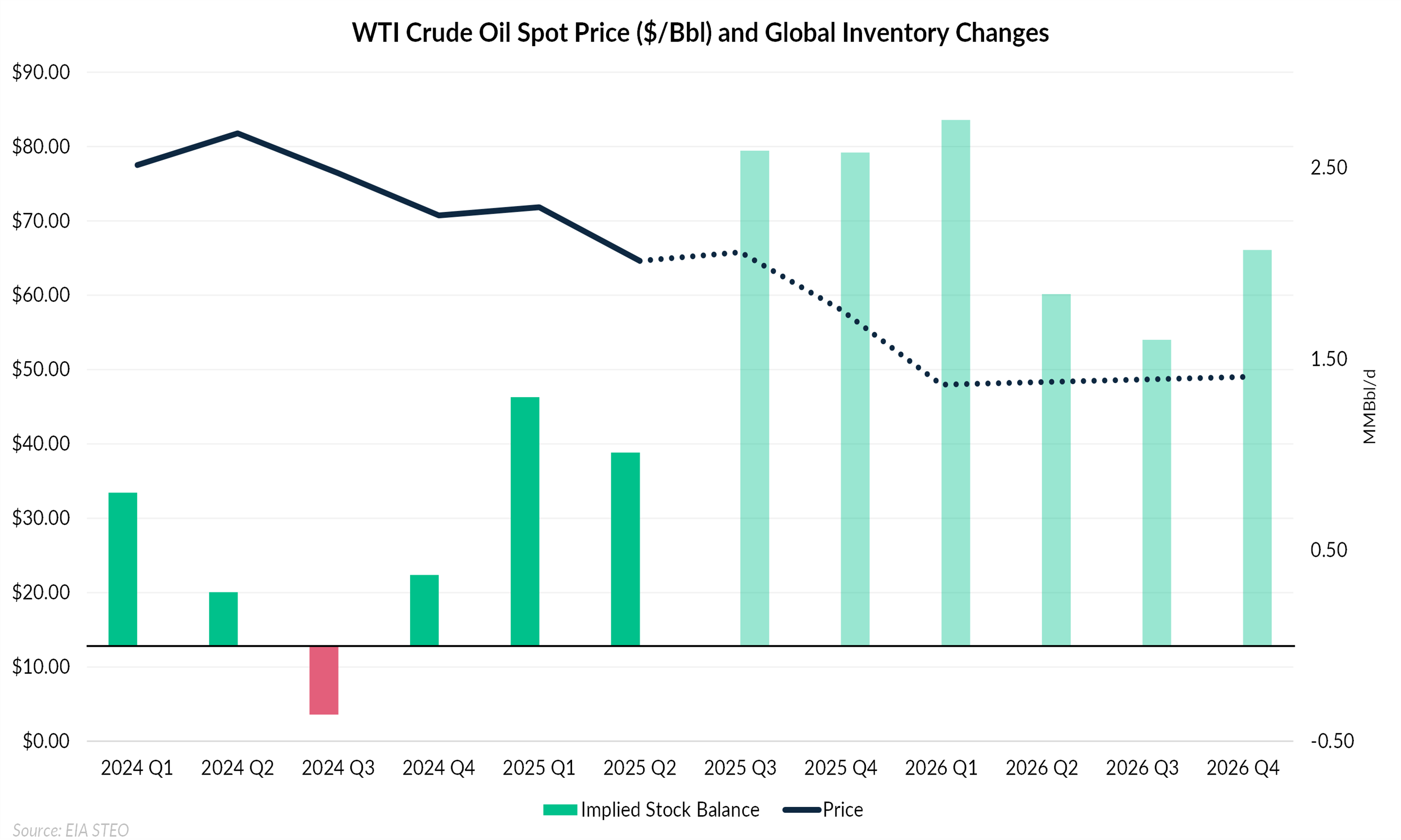As inventories accumulate, the EIA expects prices to weaken. The WTI spot price is forecast to average $58.05/Bbl in 4Q25 and decline further to $48.50/Bbl in 2026, reflecting the impact of rising storage costs and a growing surplus of unabsorbed barrels. The chart below shows that as implied stock builds accelerate, price expectations trend lower, underscoring the market’s transition toward contango and weaker prompt values.