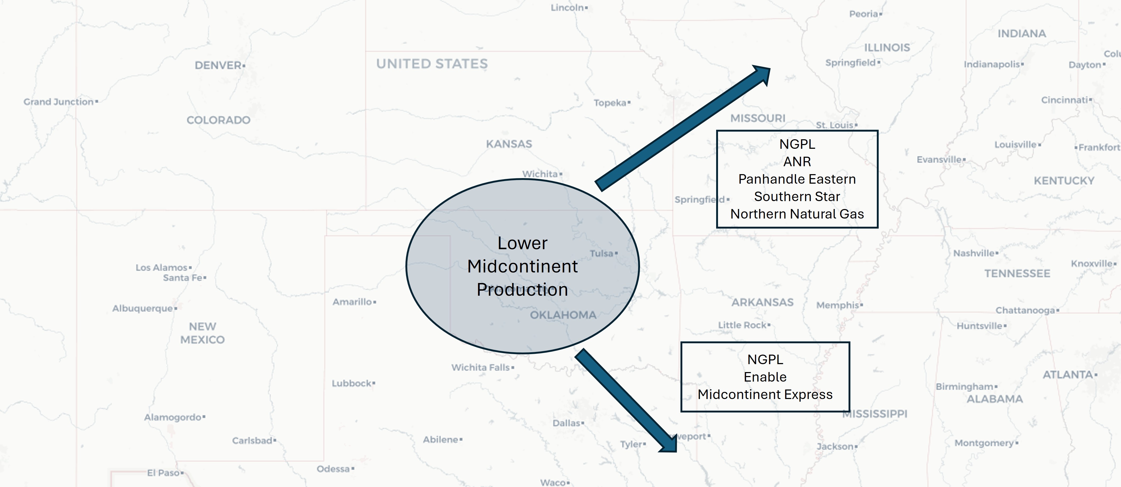 Several pipelines pass through the Midcontinent, bringing supply from west Texas and the Rockies into the Midwest. Meanwhile, gas also flows south through the region toward the Gulf Coast. During winter when the Midwest and Northeast consume the most gas, flows typically head north towards the large demand centers. There are only a few planned infrastructure expansions on the horizon, such as the small Palo Duro pipeline connecting Permian production to a system in southwest Oklahoma, and an expansion of the ANR pipeline in the Midwest.