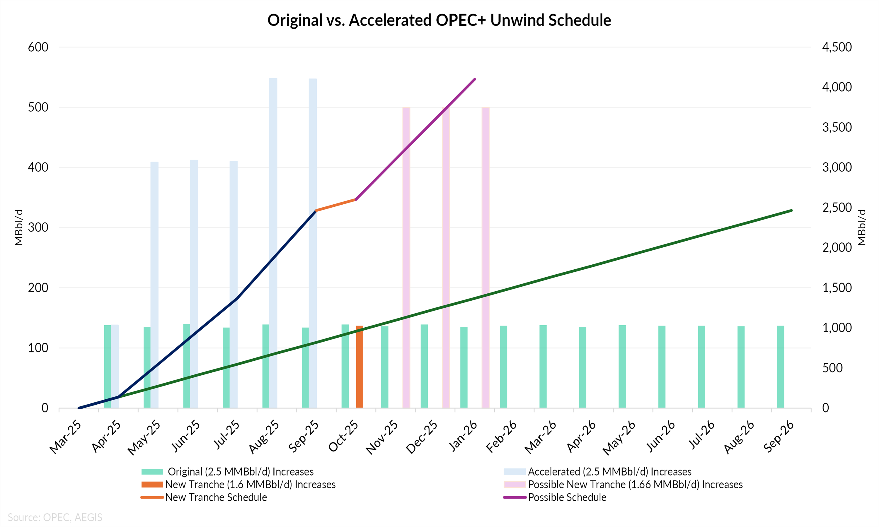 OPEC+ will meet on October 5 to debate whether to accelerate the return of 1.66 MMBbl/d of voluntary cuts. One proposal under review is to raise output by roughly 500 MBbl/d per month over three months, far faster than the 137 MBbl/d increase already scheduled for October. As the chart below shows, the orange bar reflects that October hike, marking the first step in reviving the new tranche, while the three purple bars represent the possible 500 MBbl/d additions now under consideration. The option highlights Saudi Arabia’s determination to claw back market share from US shale and other non-OPEC suppliers even as balances already point to significant oversupply ahead.