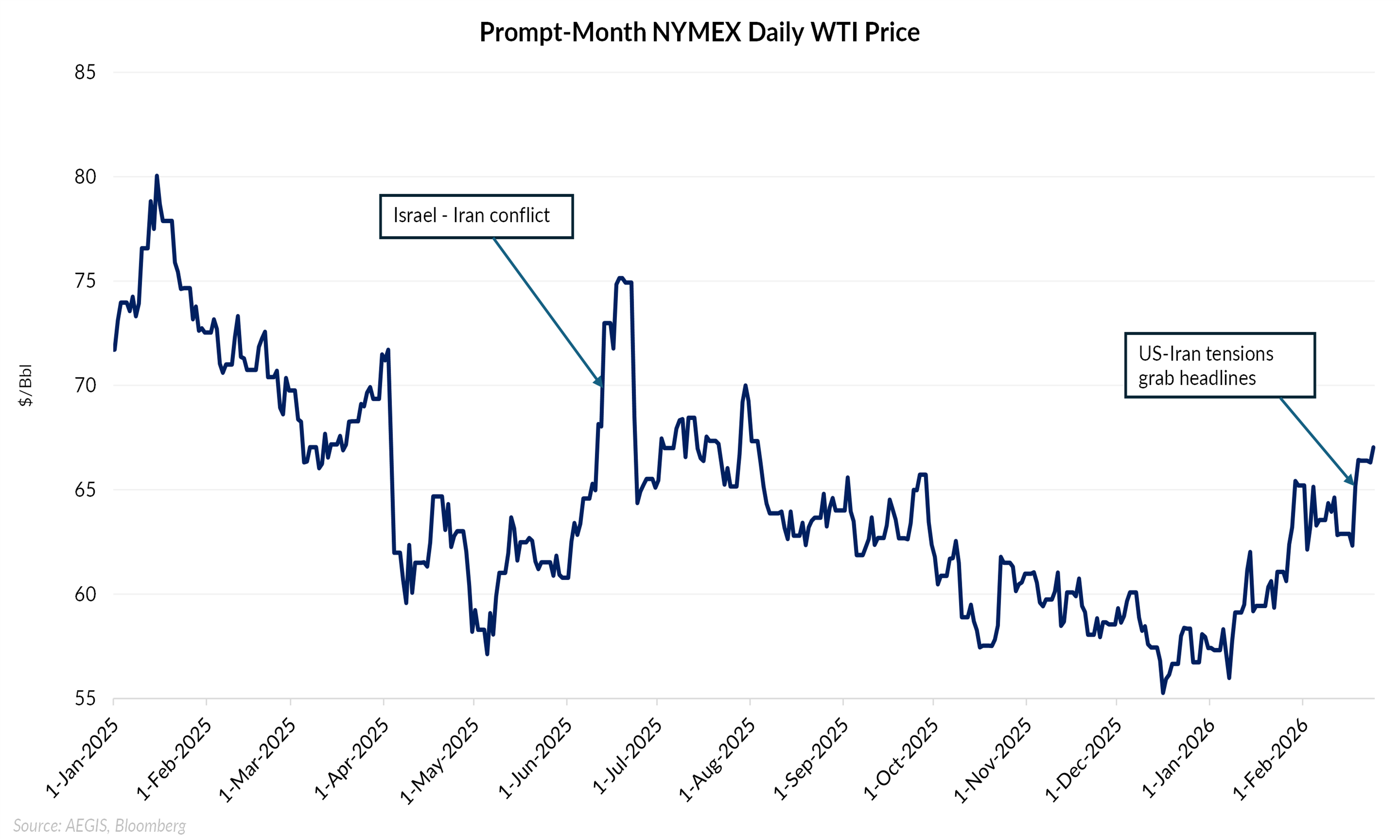 The move coincides with renewed US–Iran tensions. Increased military presence in the region and escalating rhetoric have produced sharp, headline-driven swings in prompt WTI. Similar patterns have emerged in past regional escalations, with prices rising as disruption fears intensified and retracing as those fears eased.