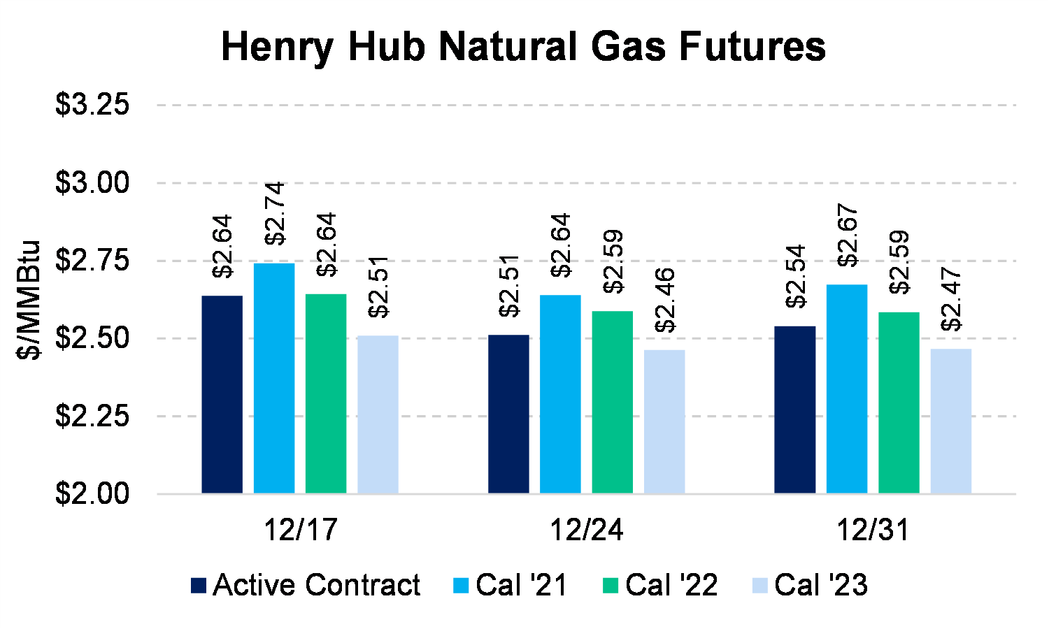Both major oil and gas benchmarks are going out in 2020 without making much noise. In Thursday's settles, ahead of the New Year's Day holiday tomorrow, most of the gas curve is hardly changed. Summer ($2.65) and next Winter ($2.89) strips were up a few cents. Oil? Similar. The Feb (now prompt) contract rose 25c (to $48.54) from its Christmas Eve close, and the entire Cal 2021 rose 12c.