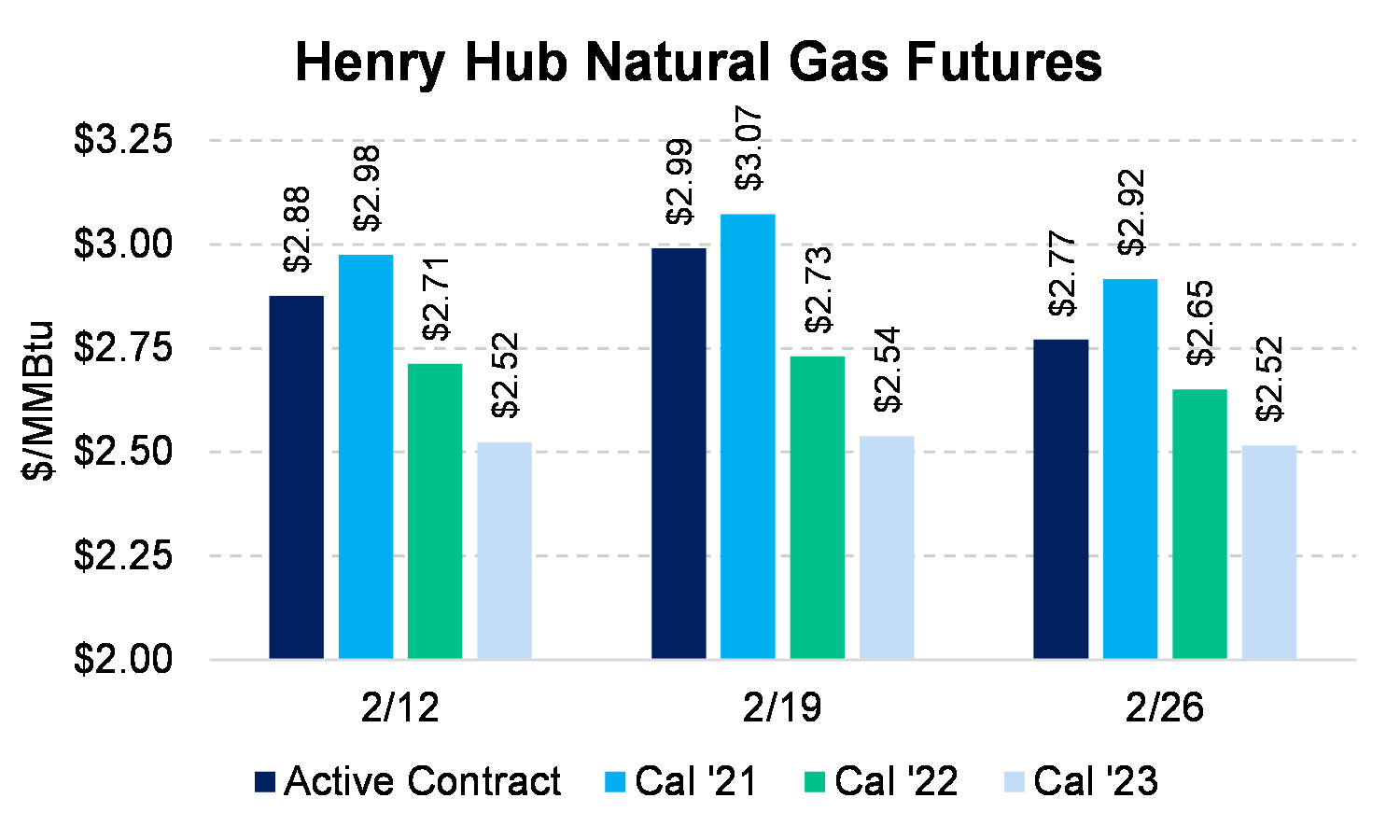 WTI has rallied over 30% since January 1 to $62/Bbl as of February 26 — the largest percentage increase to start a year in at least the past 30 years. You may hold a continued bullish view from current levels, but we recommend taking a hard look at de-risking your portfolio as Bal 2021 trades at $60/Bbl and Cal 2022 at just above $55/Bbl.