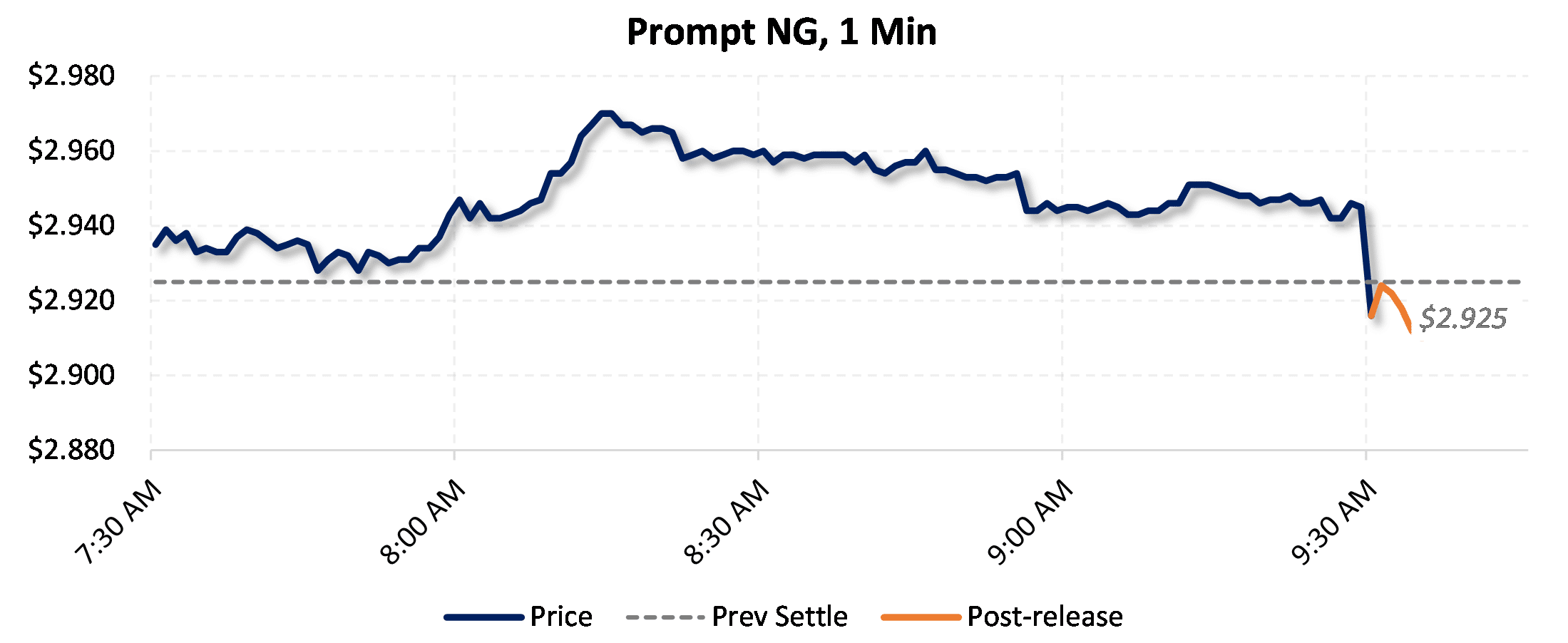 Prices were down in the five minutes following the announcement, to $2.911, from $2.946 just before 9:30am.
