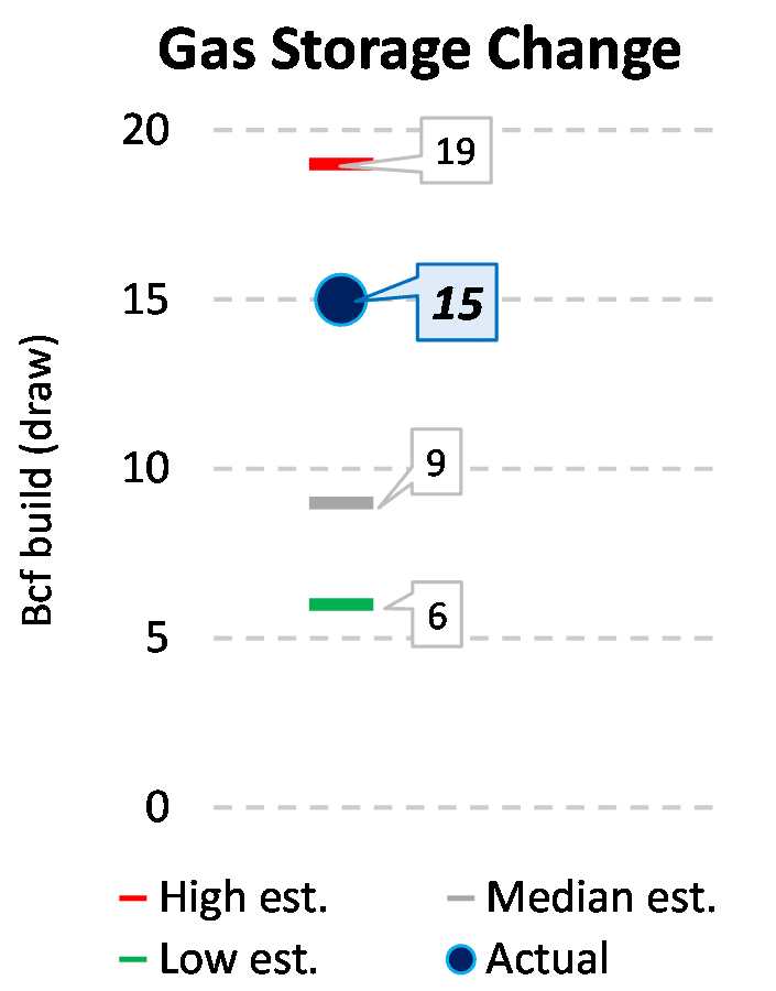 EIA reported a build of 15 Bcf for the week ending 4/23/2021. This was larger than the median estimate of 9 Bcf. Today's stat fell within the expected range, which was 19 Bcf on the more bearish end, and 6 Bcf on the more bullish