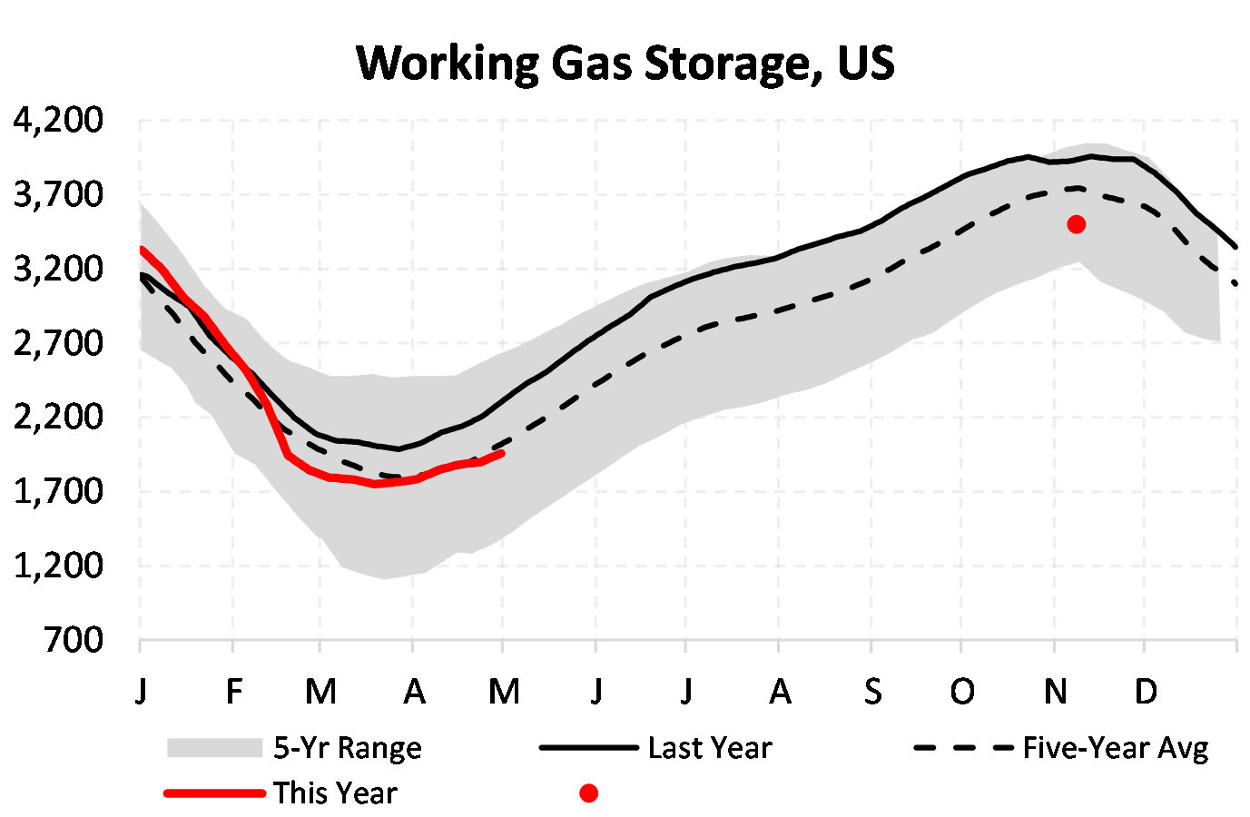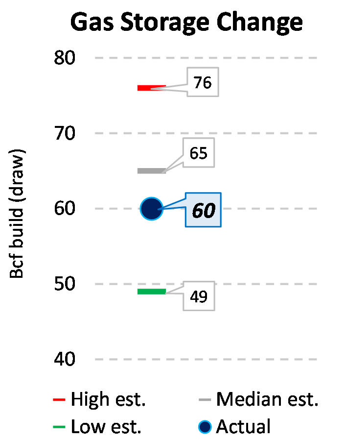 EIA reported a build of 60 Bcf for the week ending 4/30/2021. This was smaller than the median estimate of 65 Bcf. Today's stat fell within the expected range, which was 76 Bcf on the more bearish end, and 49 Bcf on the more bullish end.