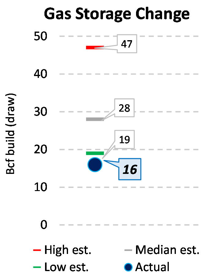 EIA reported a build of 16 Bcf for the week ending 7/02/2021. This was smaller than the median estimate of 28 Bcf. Today's stat fell outside the expected range, which was 47 Bcf on the more bearish end, and 19 Bcf on the more bullish end.