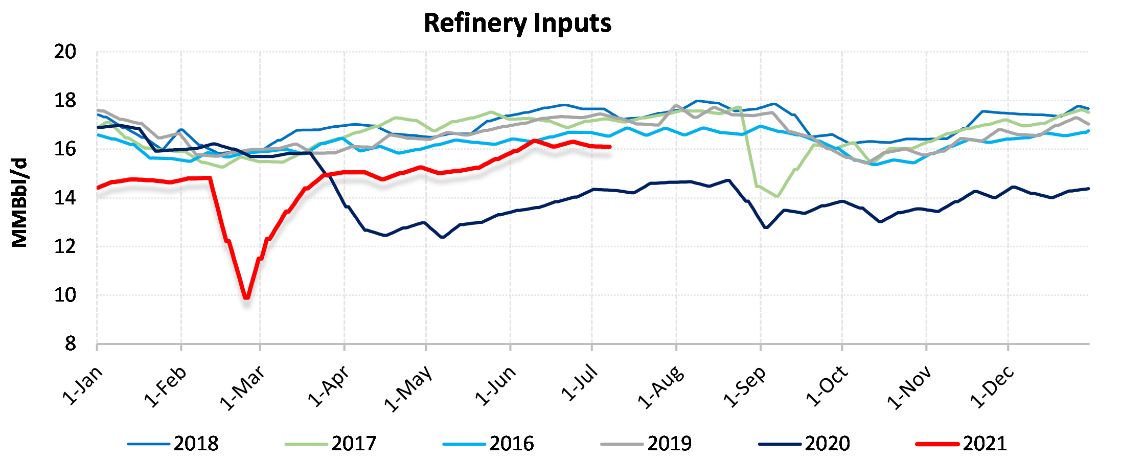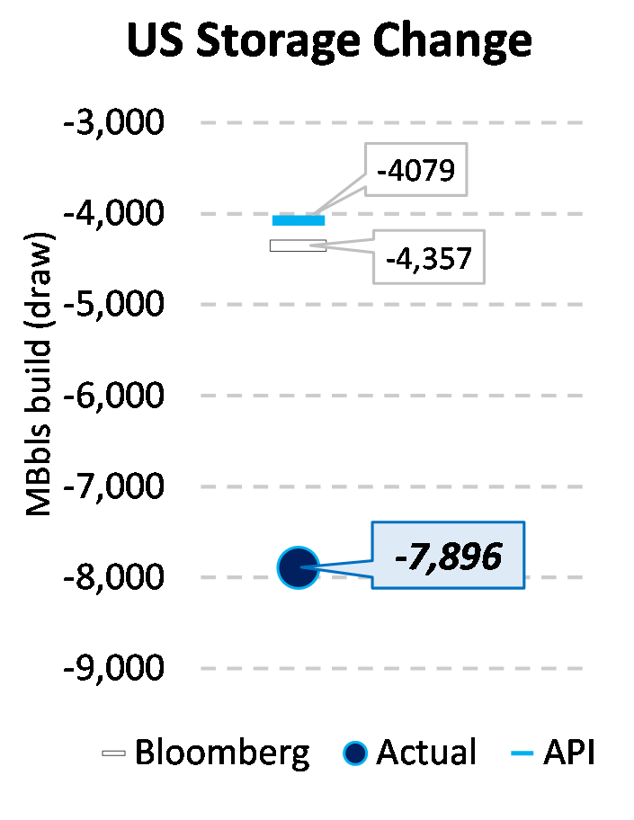 EIA reported a draw of -7896 MBbls in U.S. crude-oil inventories for the week ending 7/9/2021. This was larger than the average estimate of -4357 MBbls as reported by Bloomberg.