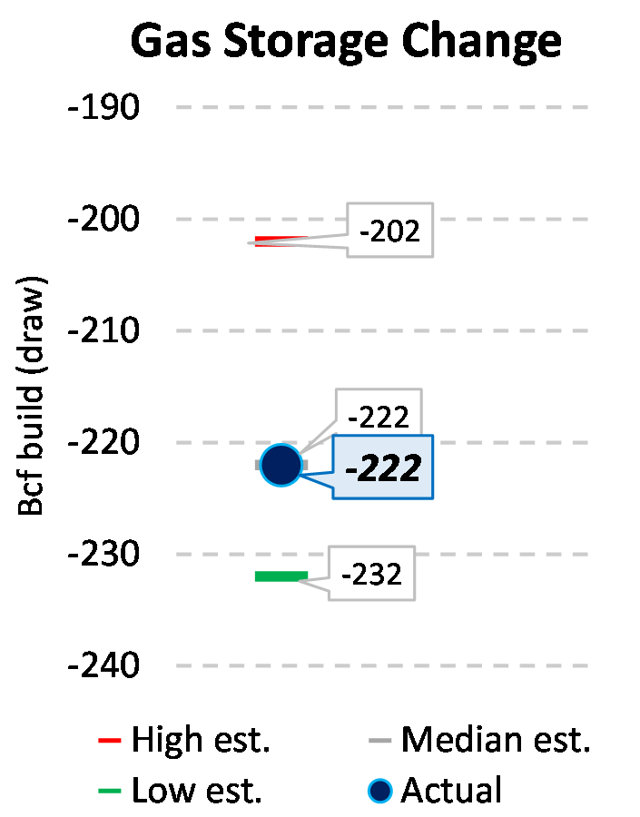 EIA reported a draw of -222 Bcf for the week ending 2/04/2022. This was equal to the median estimate of -222 Bcf. Today's stat fell within the expected range, which was -202 Bcf on the more bearish end, and -232 Bcf on the more bullish end.