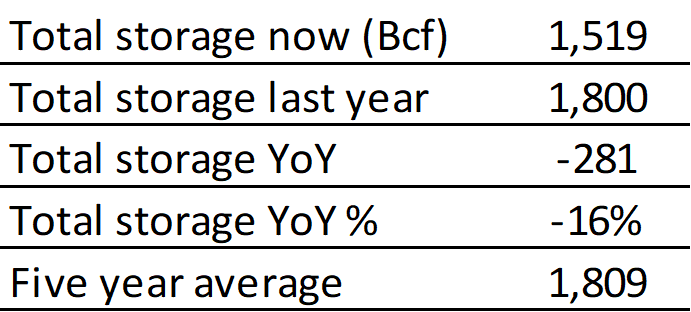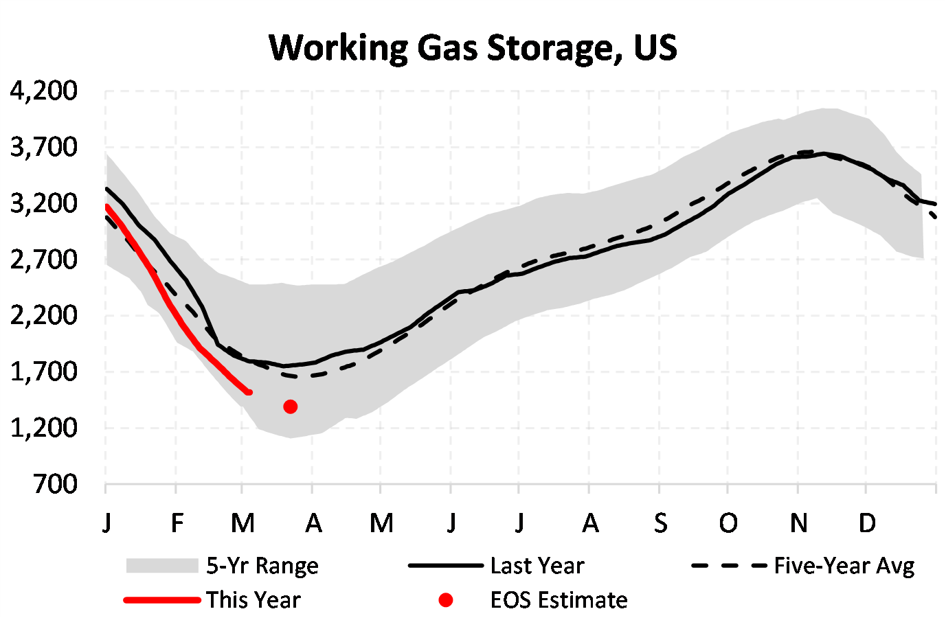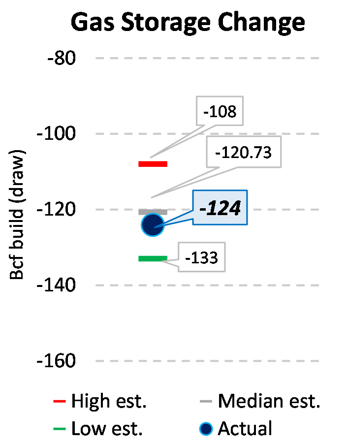 EIA reported a draw of -124 Bcf for the week ending 3/04/2022. This was larger than the median estimate of -120.73 Bcf. Today's stat fell within the expected range, which was -108 Bcf on the more bearish end, and -133 Bcf on the more bullish end.