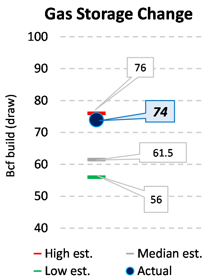 EIA reported a build of 74 Bcf for the week ending 6/17/2022. This was larger than the median estimate of 61.5 Bcf. Today's stat fell within the expected range, which was 76 Bcf on the more bearish end, and 56 Bcf on the more bullish end.