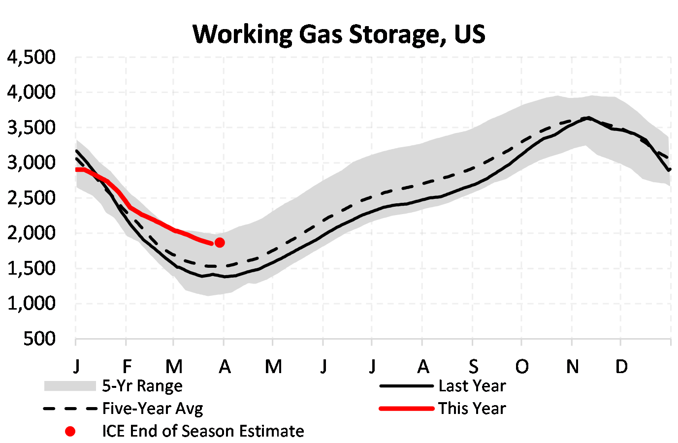 EIA reported a draw of -23 Bcf for the week ending 3/31/2023. This was larger than the median estimate of -22 Bcf. Today's stat fell within the expected range, which was -18 Bcf on the more bearish end, and -28 Bcf on the more bullish end.