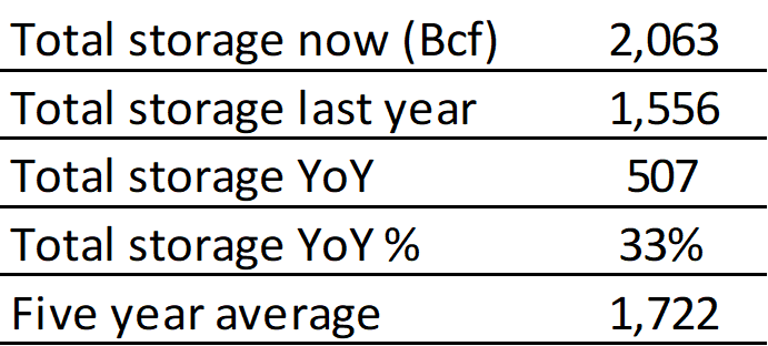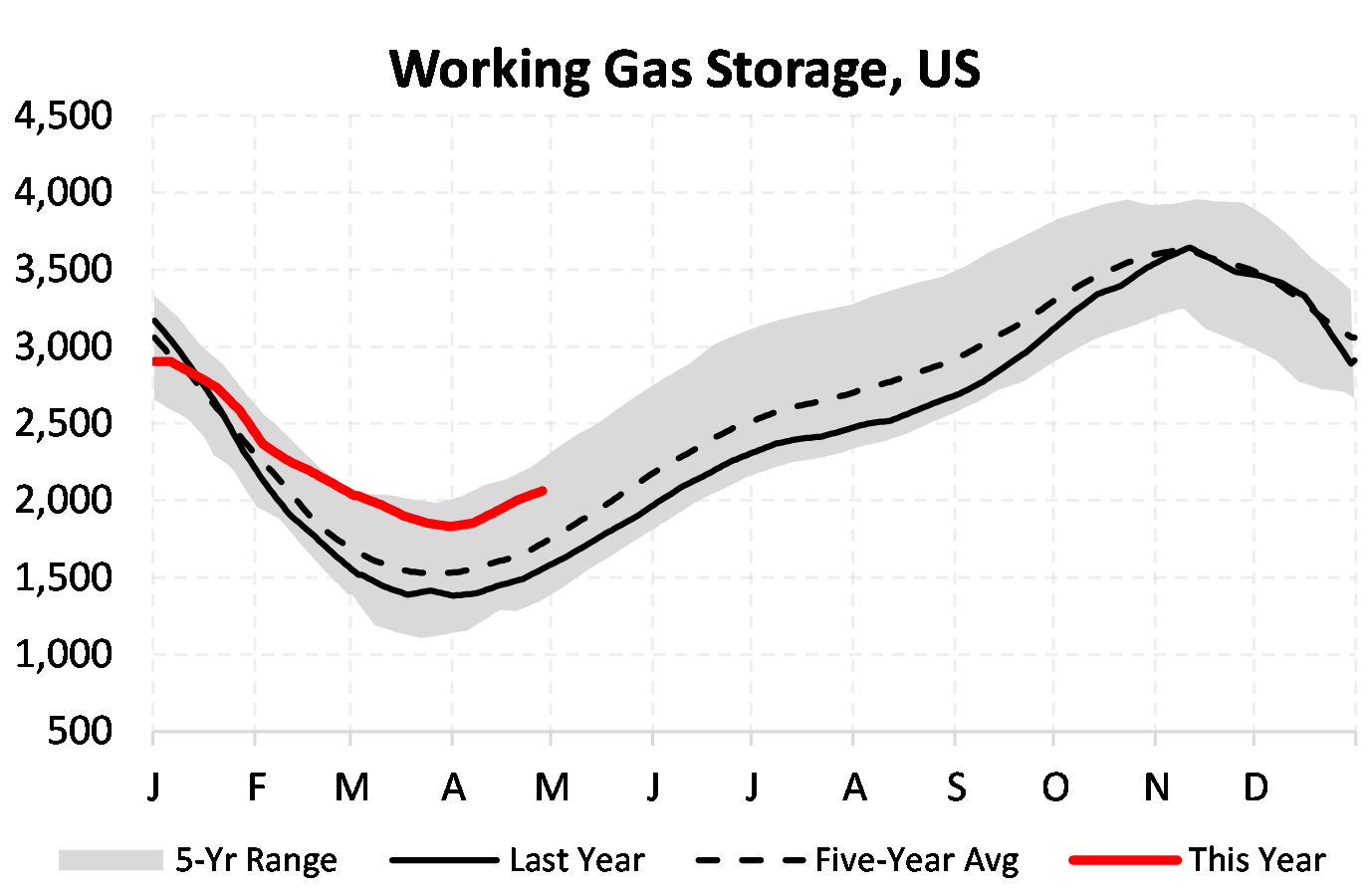 EIA reported a build of 54 Bcf for the week ending 4/28/2023. This was larger than the median estimate of 52 Bcf. Today's stat fell within the expected range, which was 57 Bcf on the more bearish end, and 47 Bcf on the more bullish end.