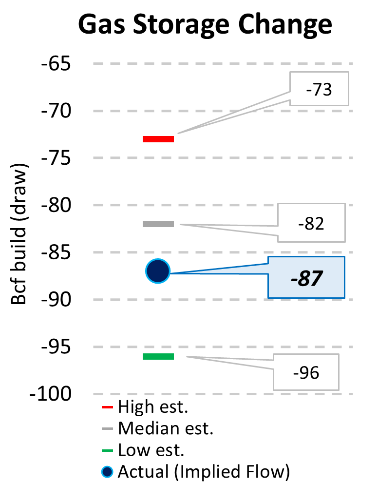 EIA reported a draw of -87 Bcf for the week ending 12/15/2023. Today's stat fell within the expected range, which was -73 Bcf on the more bearish end, and -96 Bcf on the more bullish end. This was larger than the median estimate of -82 Bcf.