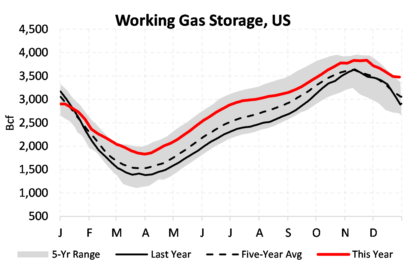 EIA reported a draw of -14 Bcf for the week ending 12/29/2023. This was smaller than the median estimate of -37 Bcf. Today's stat fell within the expected range, which was -9 Bcf on the more bearish end, and -49 Bcf on the more bullish end.