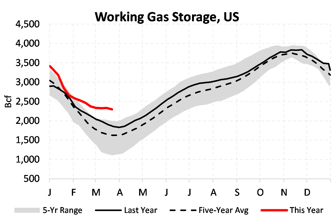 EIA reported a draw of -36 Bcf for the week ending 3/22/2024. This was larger than the median estimate of -27 Bcf. Today's stat fell within the expected range, which was -23 Bcf on the more bearish end, and -38 Bcf on the more bullish end.