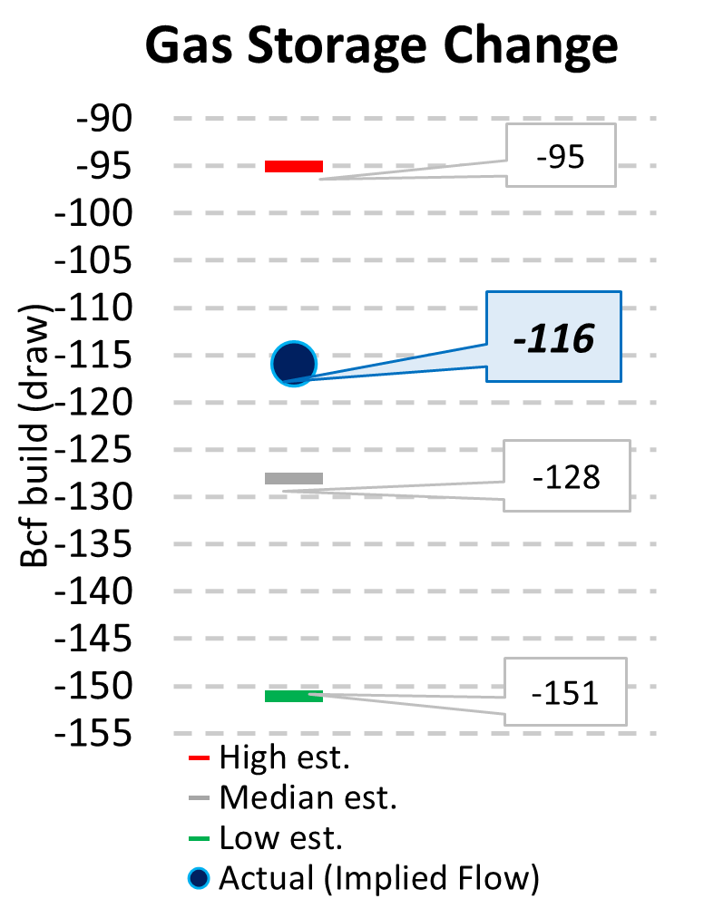 EIA reported a draw of -116 Bcf for the week ending 12/27/2024. This was smaller than the median estimate of -128 Bcf. Today's stat fell within the expected range, which was -95 Bcf on the more bearish end, and -151 Bcf on the more bullish end.