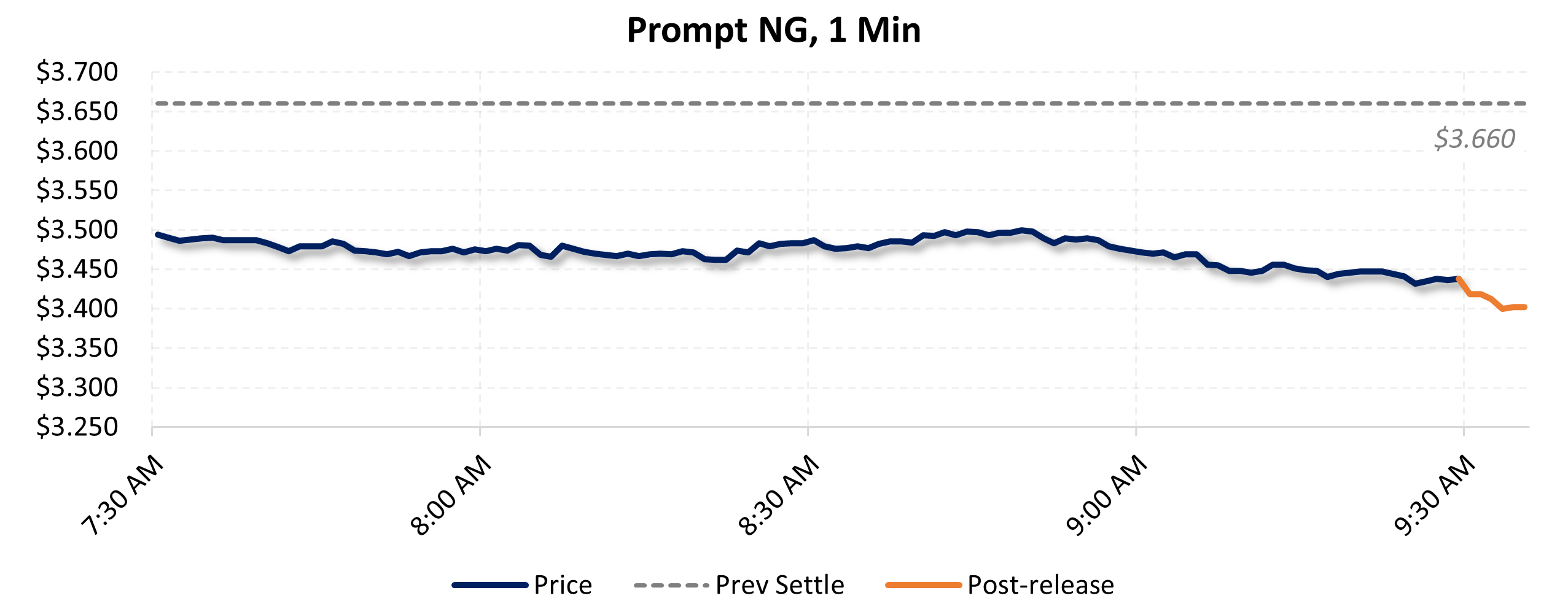 Prices were down in the five minutes following the announcement, to $3.402, from $3.438 just before 9:30am.