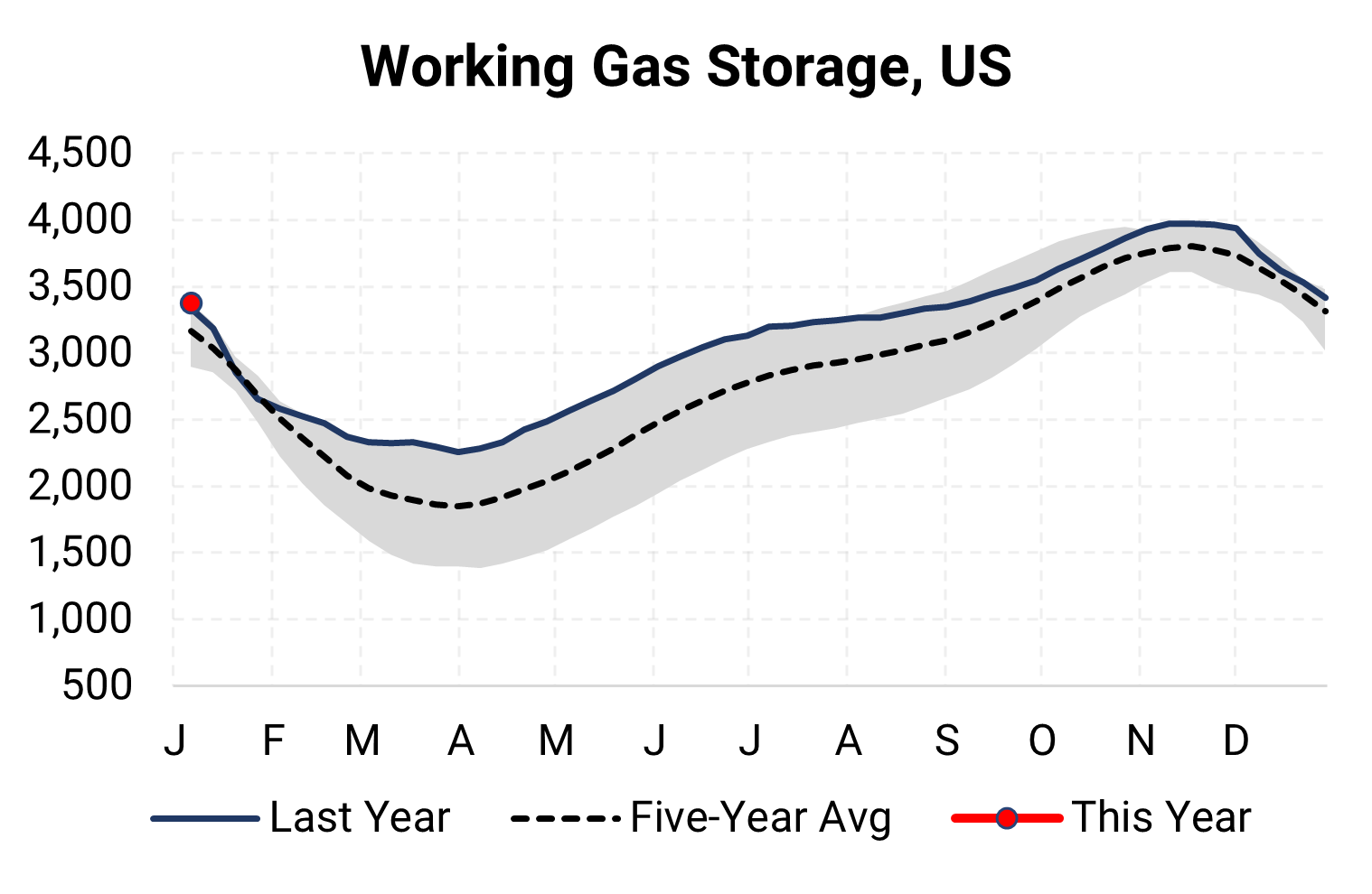 Inventories for the US are now at a deficit of 3 Bcf to last year and a surplus of 207 Bcf to the five-year average.