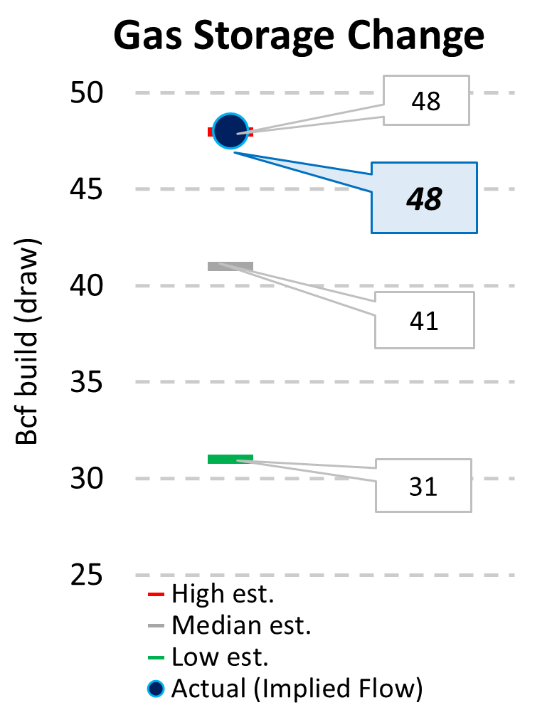 EIA reported a build of 48 Bcf for the week ending 7/25/2025. This was larger than the median estimate of 41 Bcf. Today's stat fell within the expected range, which was 48 Bcf on the more bearish end, and 31 Bcf on the more bullish end.