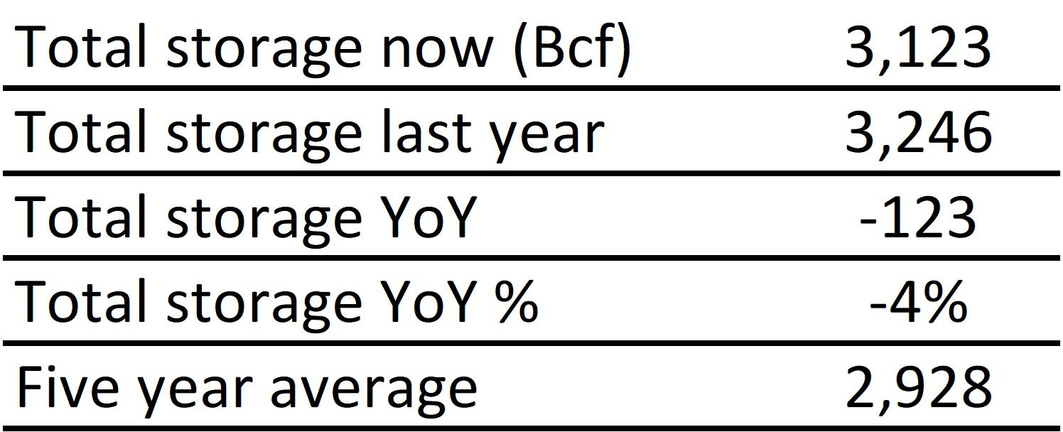 Inventories for the US are now at a deficit of 123 Bcf to last year and a surplus of 195 Bcf to the five-year average. |