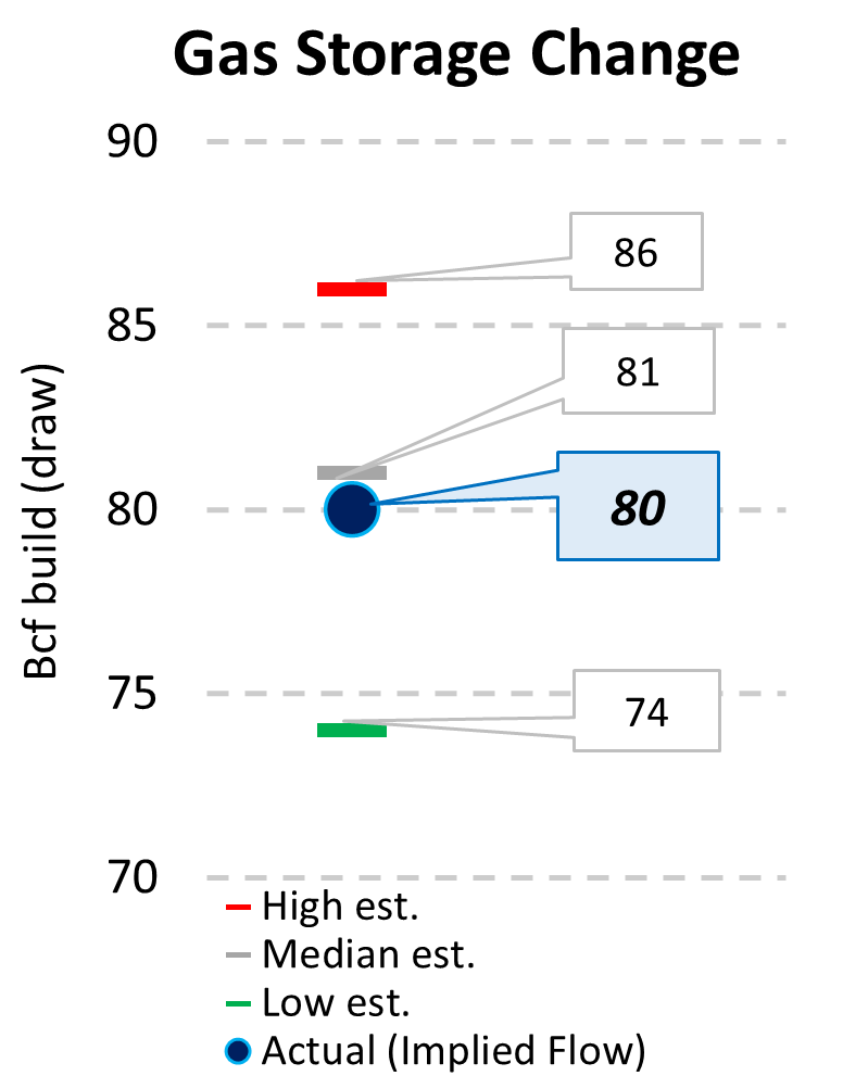 EIA reported a build of 80 Bcf for the week ending 10/10/2025. This was smaller than the median estimate of 81 Bcf. Today's stat fell within the expected range, which was 86 Bcf on the more bearish end, and 74 Bcf on the more bullish end.