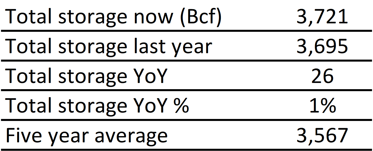 Inventories for the US are now at a surplus of 26 Bcf to last year and a surplus of 154 Bcf to the five-year average. |