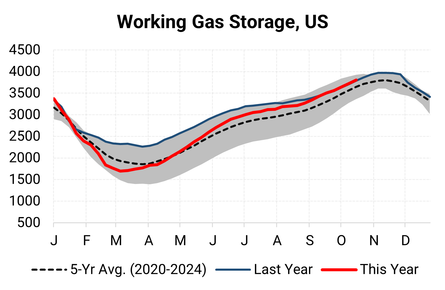 EIA reported a build of 87 Bcf for the week ending 10/17/2025. This was larger than the median estimate of 83 Bcf. Today's stat fell outside the expected range, which was 86 Bcf on the more bearish end, and 72 Bcf on the more bullish end.
