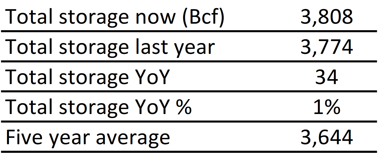 Inventories for the US are now at a surplus of 34 Bcf to last year and a surplus of 164 Bcf to the five-year average. |