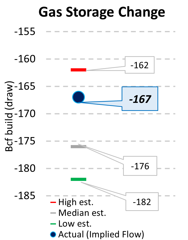 EIA reported a draw of -167 Bcf for the week ending 12/12/2025. This was smaller than the median estimate of -176 Bcf. Today's stat fell within the expected range, which was -162 Bcf on the more bearish end, and -182 Bcf on the more bullish end.