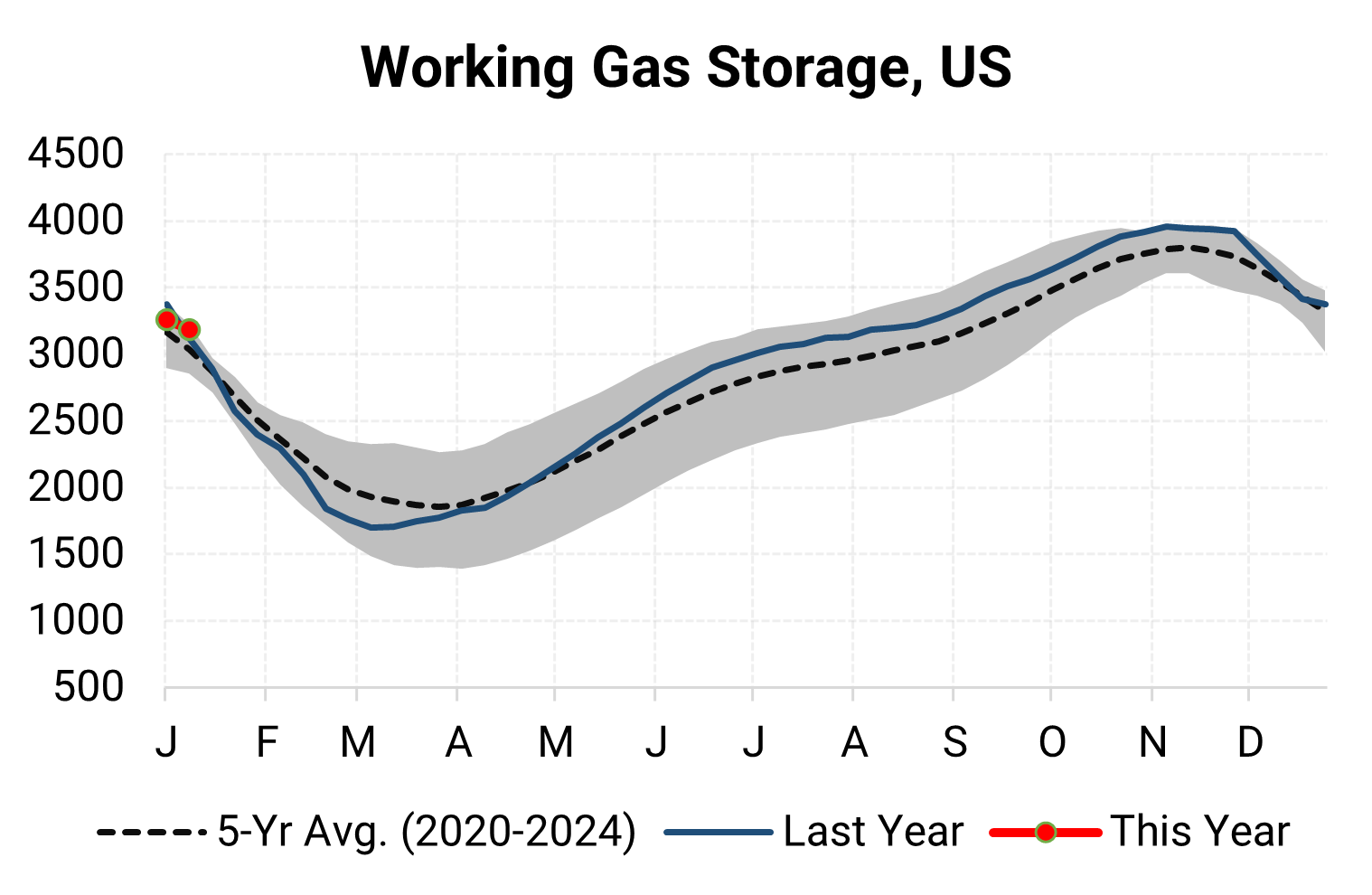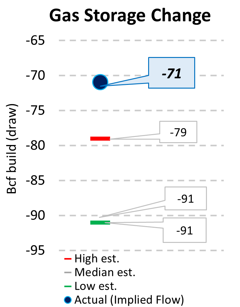EIA reported a draw of -71 Bcf for the week ending 1/09/2026. This was smaller than the median estimate of -91 Bcf. Today's stat fell outside the expected range, which was -79 Bcf on the more bearish end, and -91 Bcf on the more bullish end.