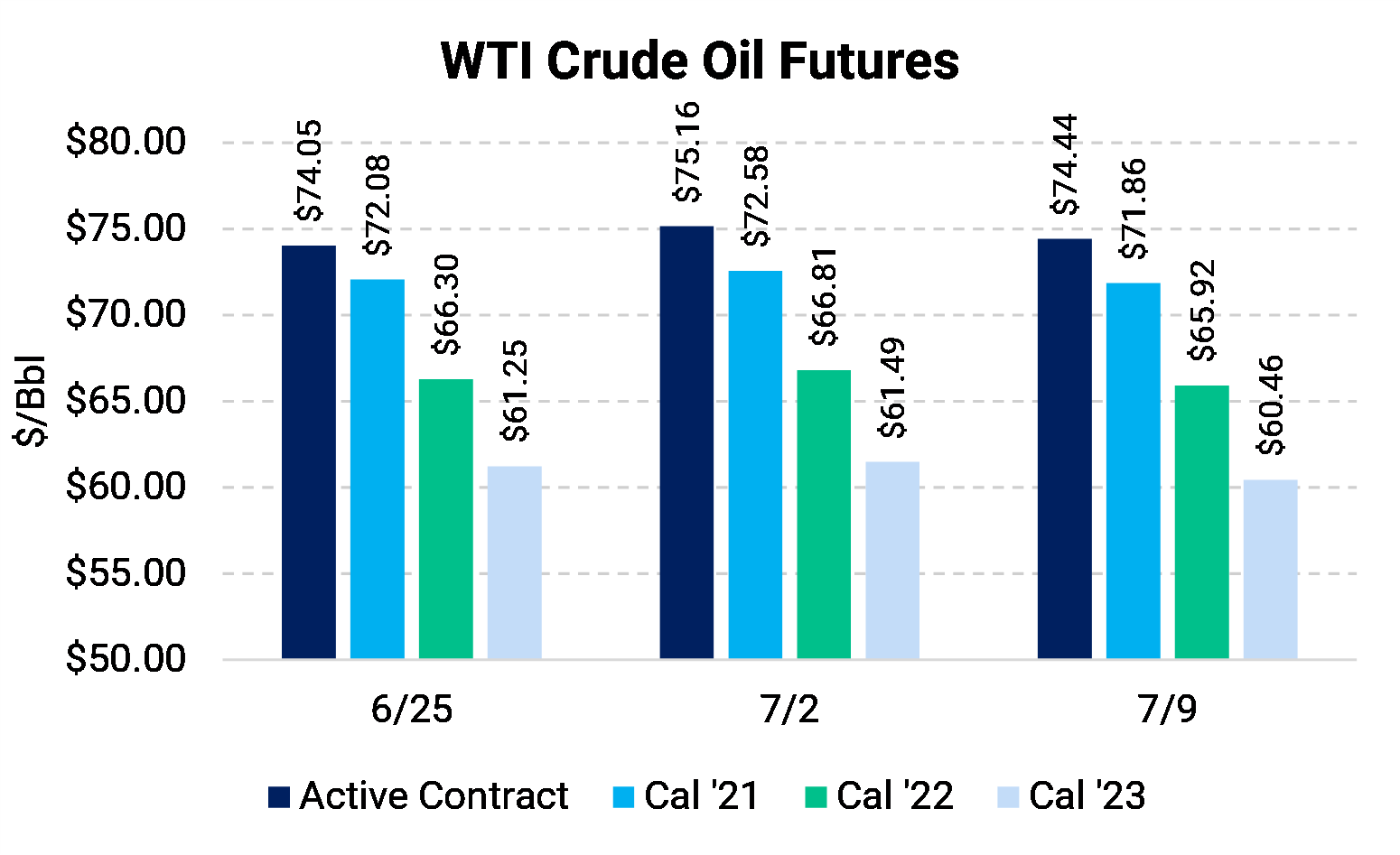 Oil prices were volatile during the week ending July 9, as an ongoing OPEC spat kept traders nervous. There is still no agreement between Saudi Arabia and the UAE regarding supply increases from OPEC. Traders had briefly interpreted the cancellation in OPEC+ talks Monday as bullish, with WTI touching $76.98 in early Tuesday morning trading. However, oil spiraled lower to $70.76 as the oil markets worried over a potential premature rise in OPEC+ production if the group could not reach consensus. However, the market apparently does not expect a full OPEC breakdown; WTI recovered to $74.56/Bbl by Friday’s settlement.