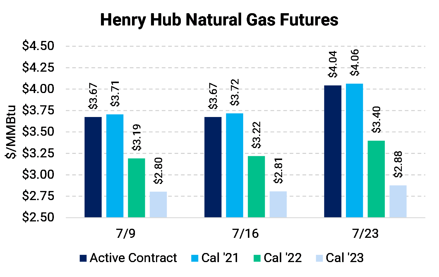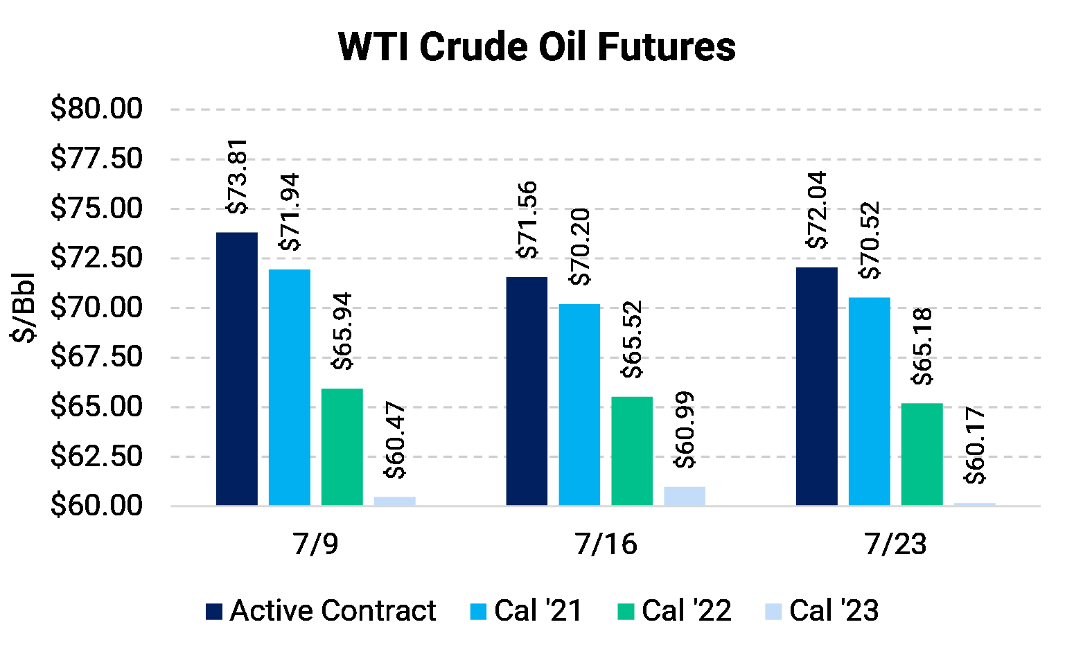 AEGIS hedging recommends swaps for clients looking to add volumes in the balance of 2021. For Cal 2022, trading near an average $65/Bbl, we continue to suggest costless collars to allow for some upside participation. Cal 2023 is trading at $60/Bbl as of Friday; we also recommend upside-friendly structures like collars for these tenors.