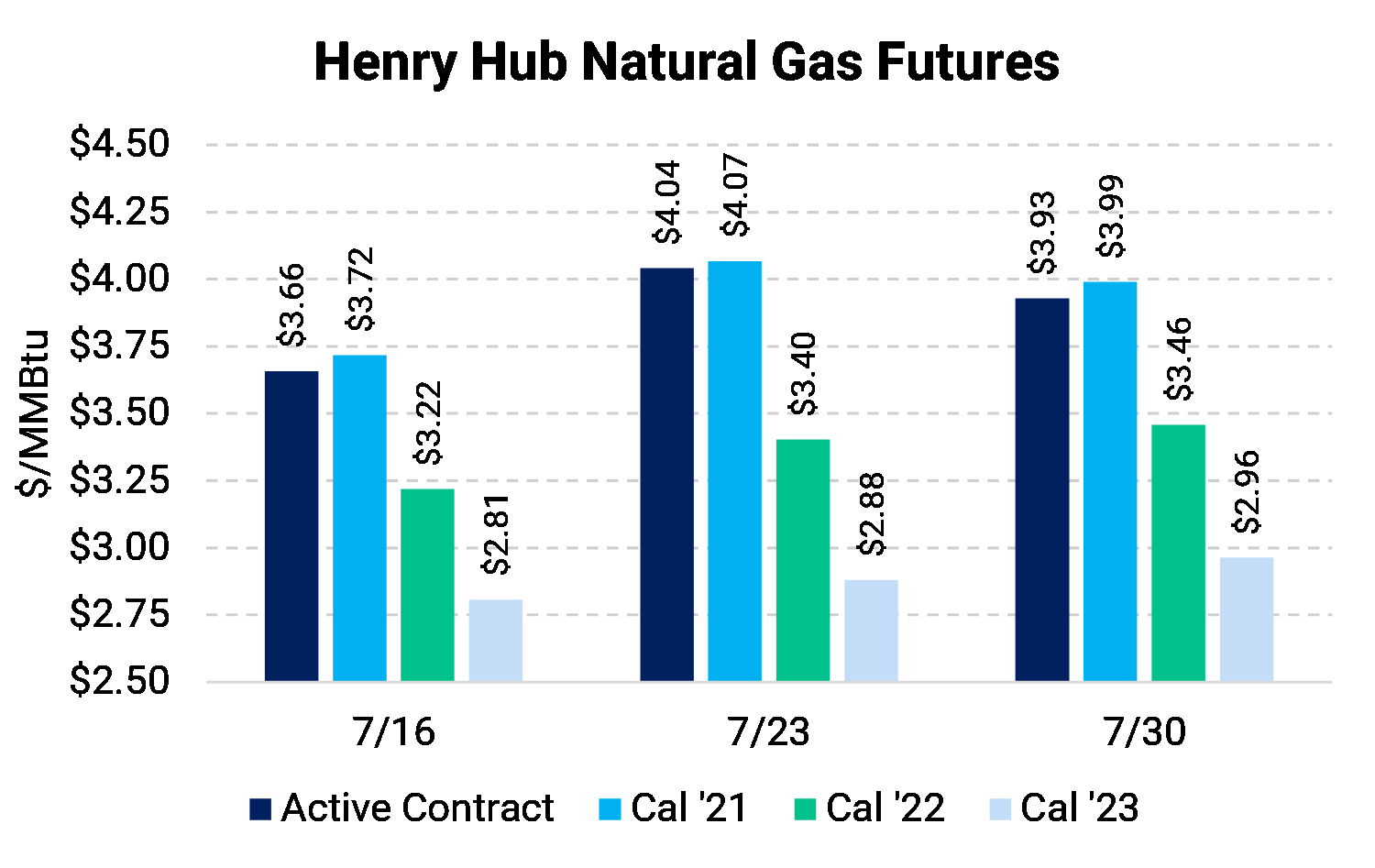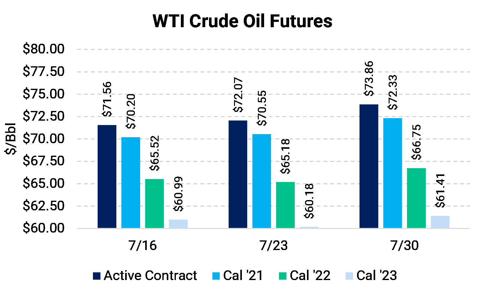 Oil prices rose for a second consecutive week, with the prompt-month (Sep ’21) WTI contract settling at $73.95/Bbl on Friday. The contract has recovered $7.60/Bbl after reaching a recent low of $66.35 during the July 19 selloff.