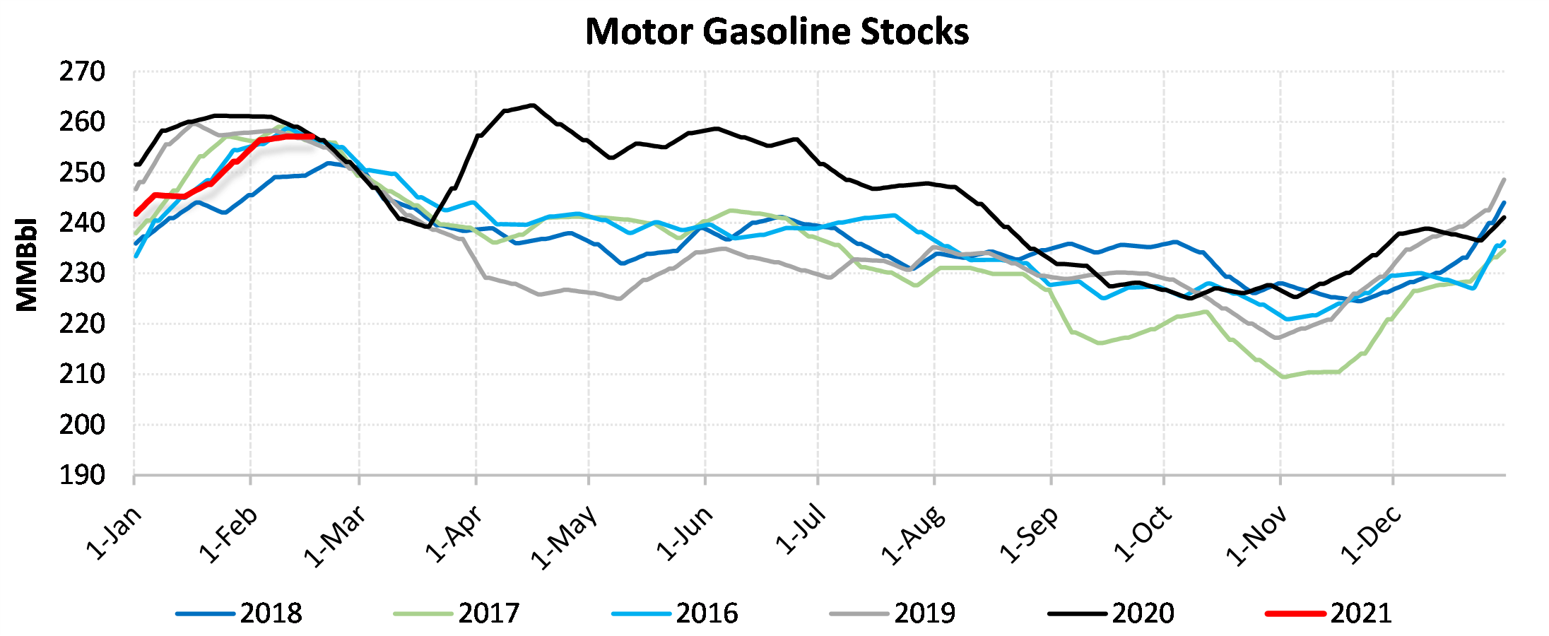 EIA reported a build of 1285 MBbls in U.S. crude-oil inventories for the week ending 2/19/2021. This was smaller than the average estimate of -6742 MBbls as reported by Bloomberg.